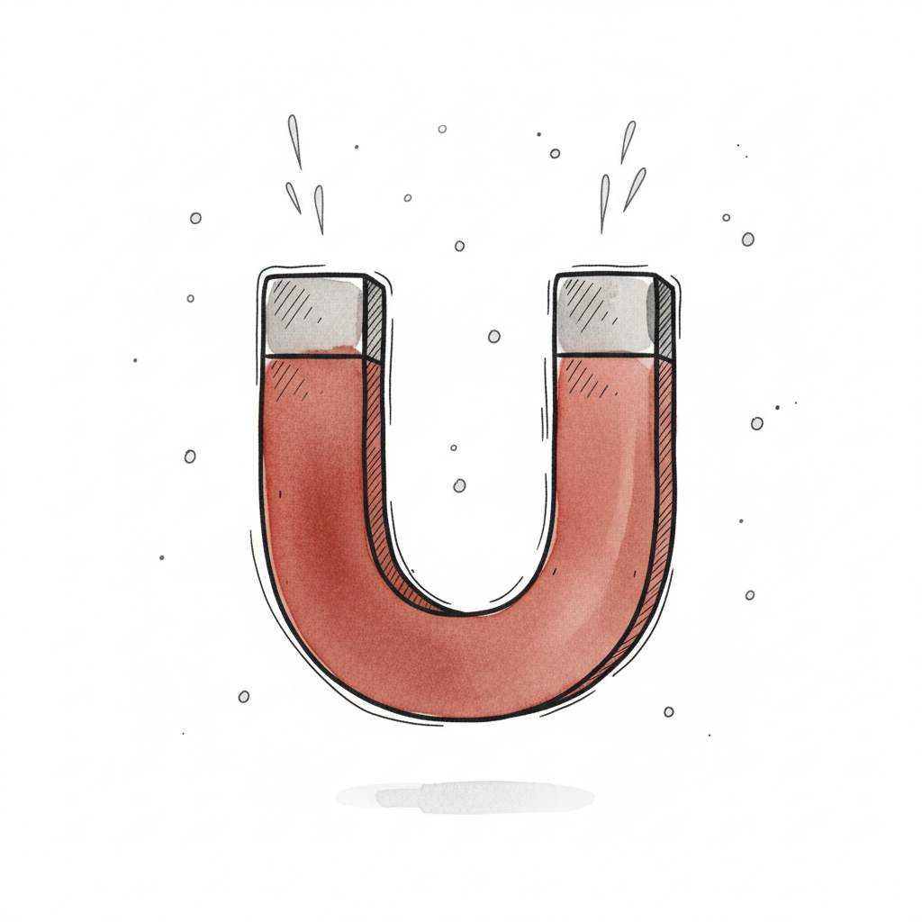 Roter Hufeisenmagnet im Aquarellstil mit spritzenden Partikeln auf weißem Grund.