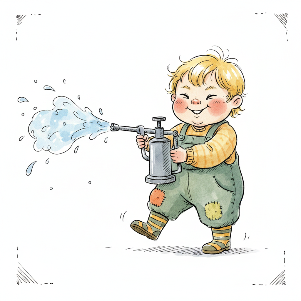 Fröhlicher Cartoon-Charakter in blauer Latzhose spritzt Wasser mit einer roten Wasserpistole.