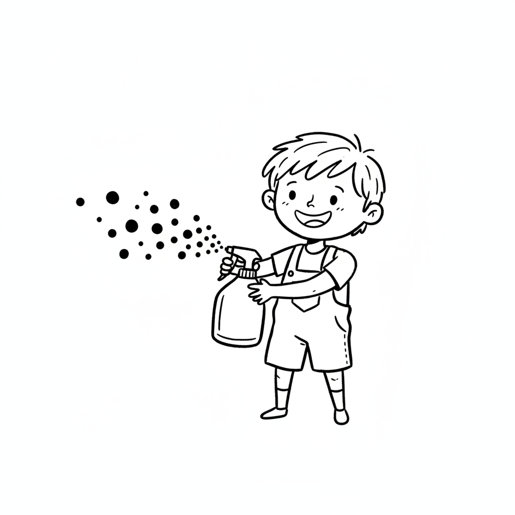 Ein lächelnder Cartoon-Junge sprüht mit einer Sprühflasche. Schwarz-Weiß-Illustration.