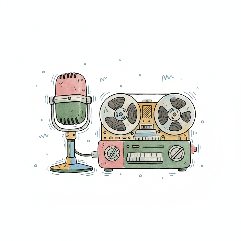 Bunte Illustration eines Retro-Mikrofons und eines Spulentonbandgeräts in Aquarell-Optik.