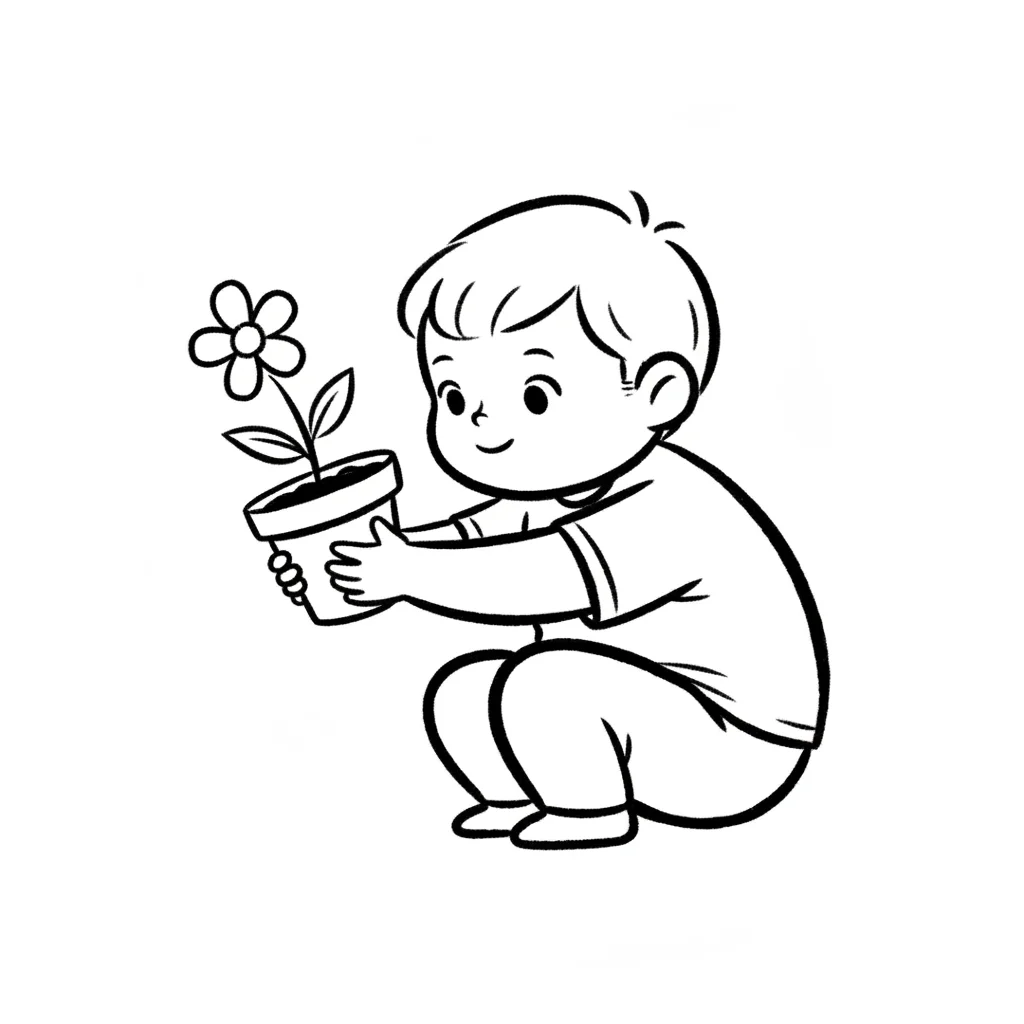 Ein lächelnder Cartoon-Junge hockt und hält einen Blumentopf mit einer Blume.