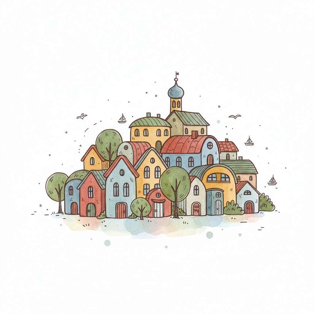 Bunte, handgezeichnete Illustration einer malerischen Stadt mit Häusern, Bäumen und einem Kirchturm.