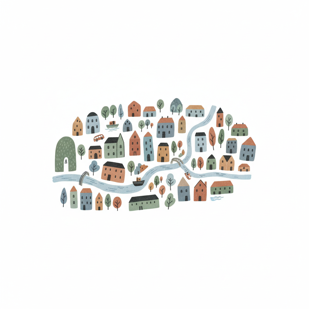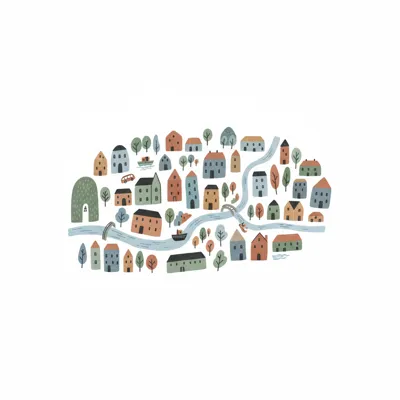 Bunte, handgezeichnete Stadtlandschaft mit Häusern, Bäumen, Fluss und Brücken im Cartoon-Stil.