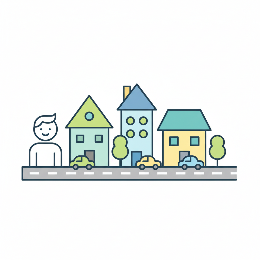 Stilisierte Darstellung einer Stadtlandschaft mit Häusern, Autos, Bäumen und einem lächelnden Menschen.