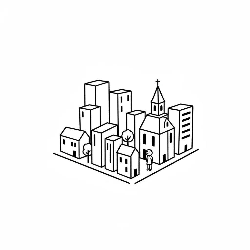 Bunte Illustration einer Stadtlandschaft mit Häusern, Kirche, Laden und einer Person auf der Straße.