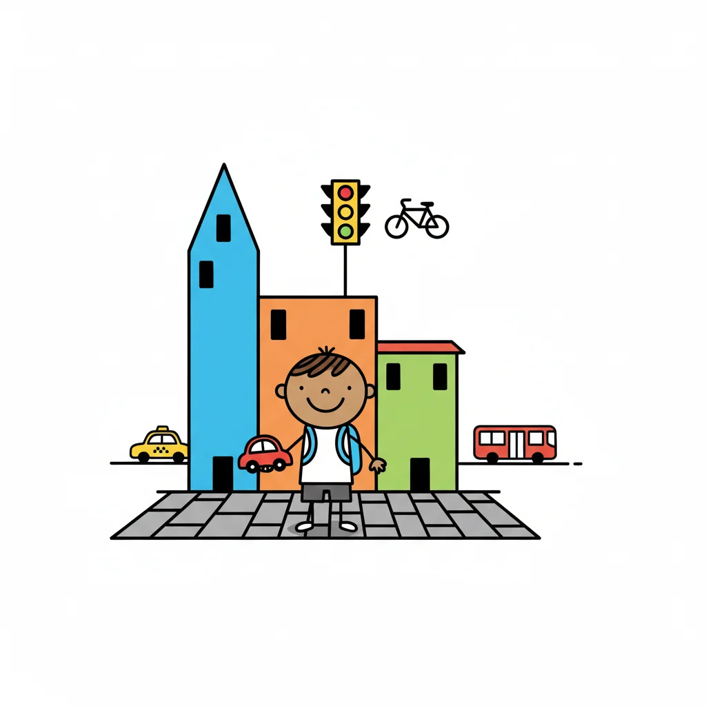 Fröhlicher Junge mit Spielzeugauto in einer bunten Stadtlandschaft mit Verkehrsmitteln.