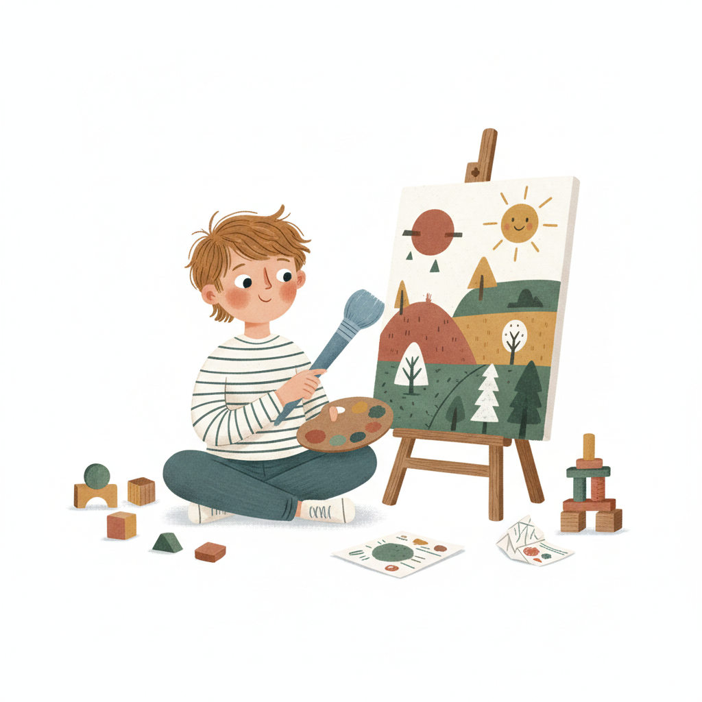 Ein Junge malt ein farbenfrohes Landschaftsbild auf einer Staffelei, umgeben von Spielzeug.