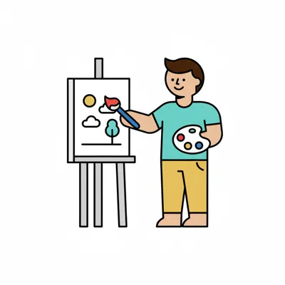 Strichzeichnung eines lächelnden Jungen, der mit einem Pinsel auf einer Staffelei malt.