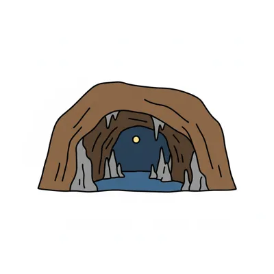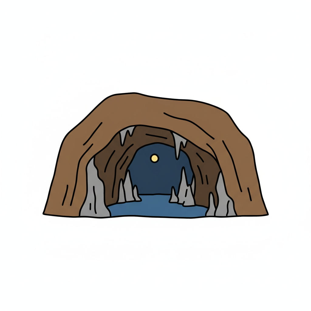 Gezeichnete Höhle mit Wasser, Stalaktiten und Stalagmiten, beleuchtet von einem Mond.