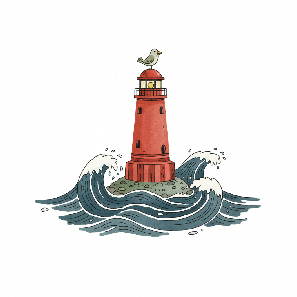 Roter Leuchtturm auf Felseninsel, umgeben von Wellen, mit Möwe auf der Spitze. Aquarellstil.