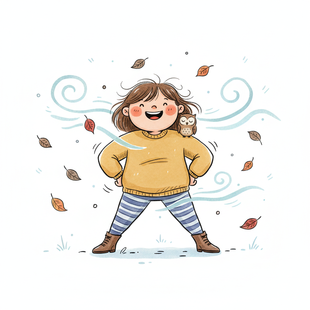 Fröhliches Mädchen mit Eule im Herbstwind, umgeben von fallenden Blättern.