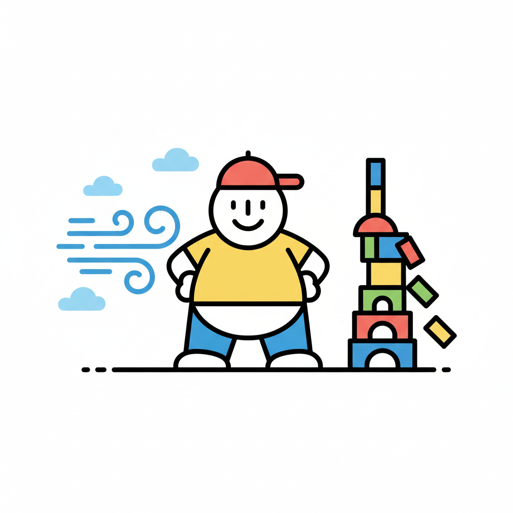 Ein lächelnder Junge steht neben einem umfallenden Bausteinturm, während der Wind weht.