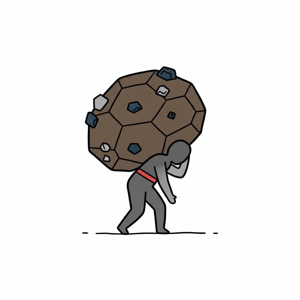 Eine Person trägt einen riesigen, schweren Felsen auf dem Rücken, der sie stark belastet.