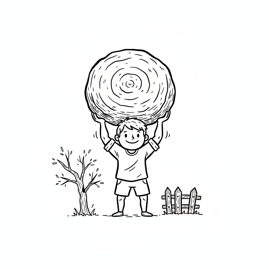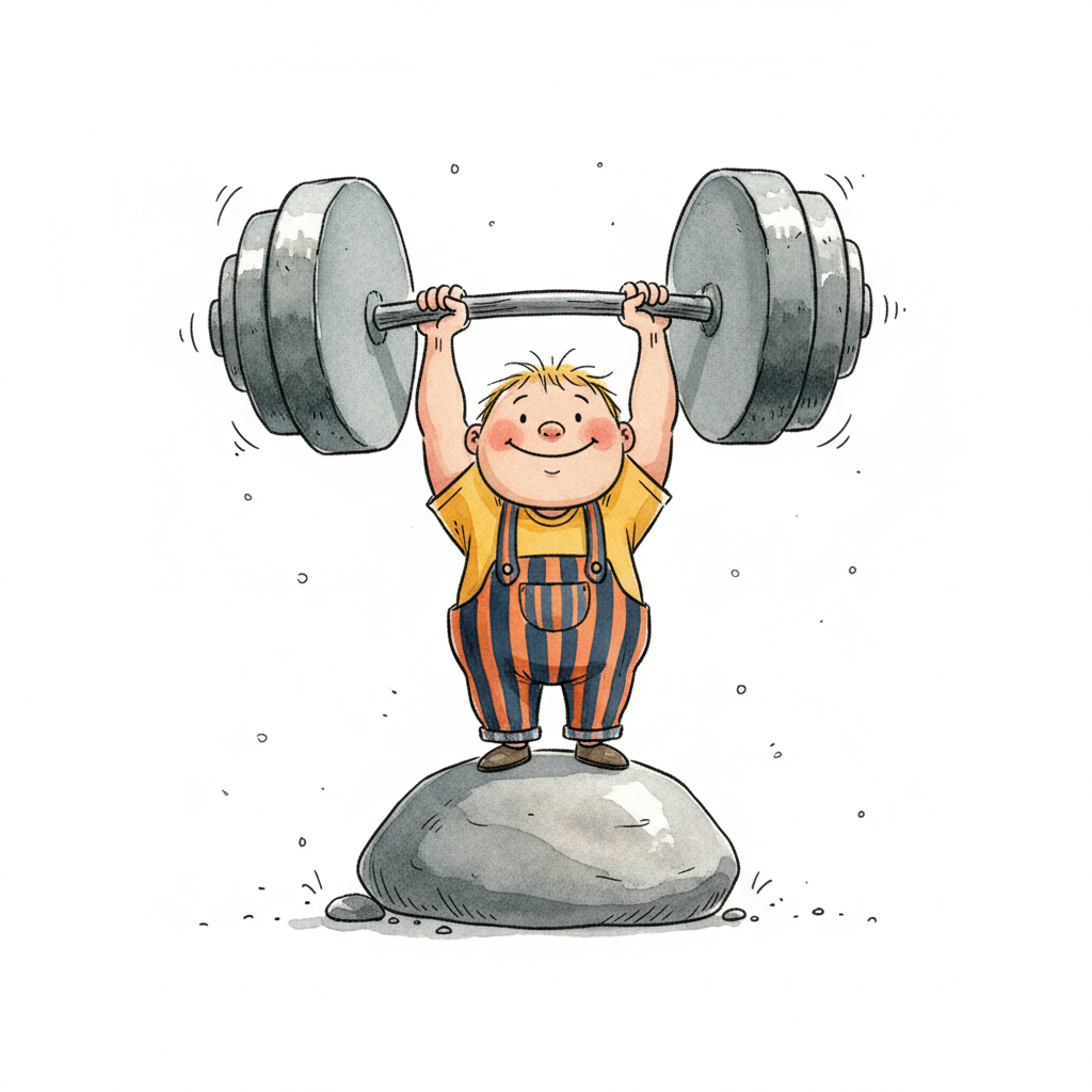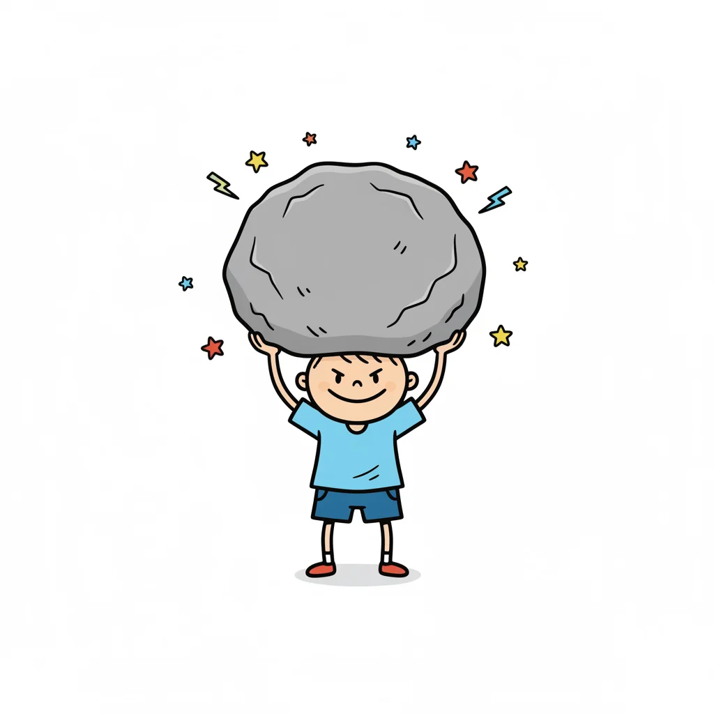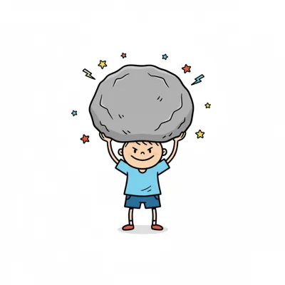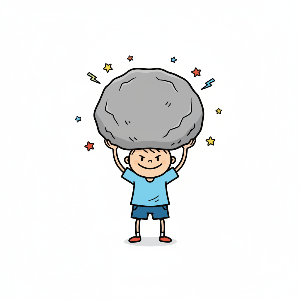 Starker Cartoon-Junge hebt riesigen Stein über Kopf, umgeben von Sternen und Blitzen.