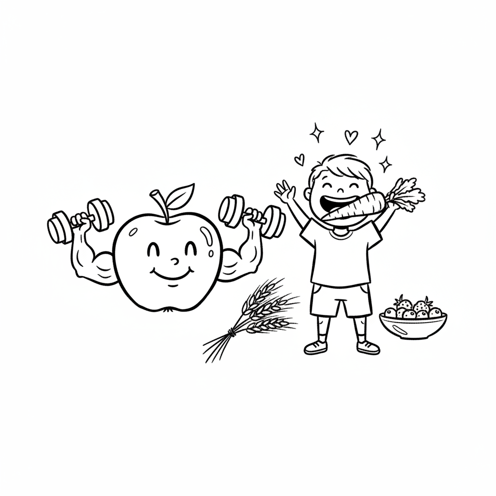Gesunde Ernährung: Starker Apfel, glückliches Kind mit Karotte, Weizen, Erdbeeren.