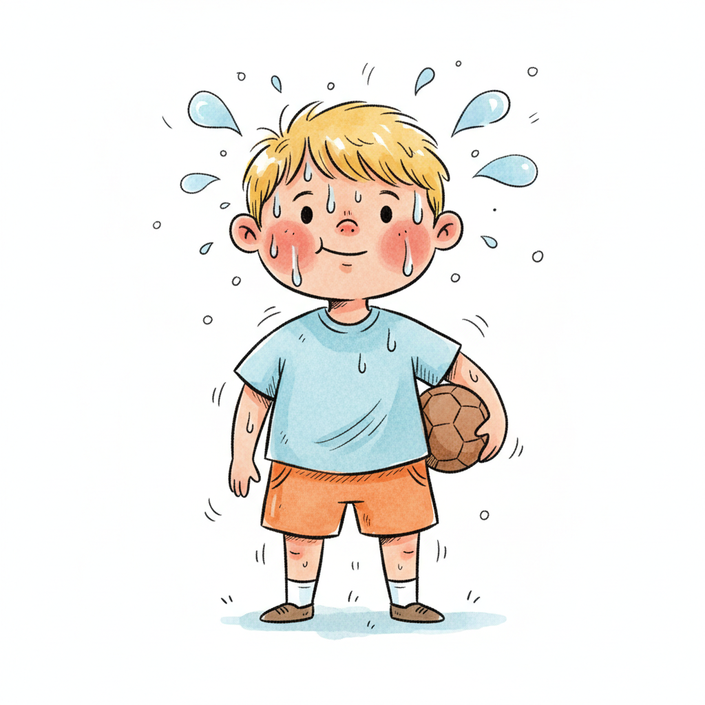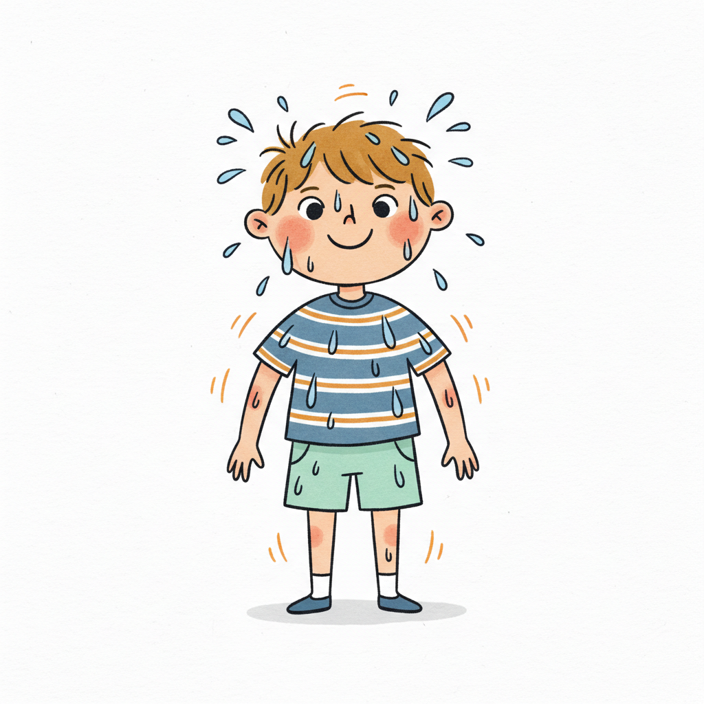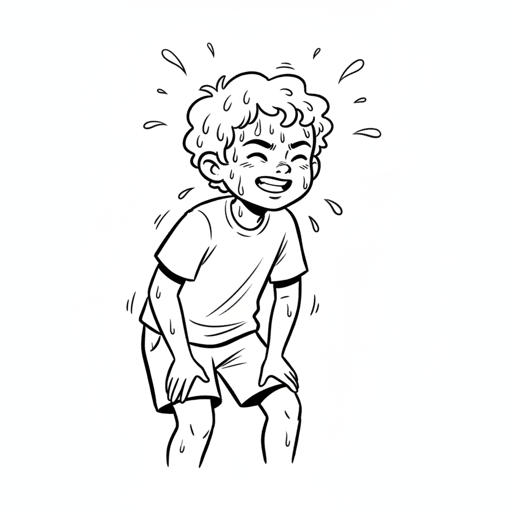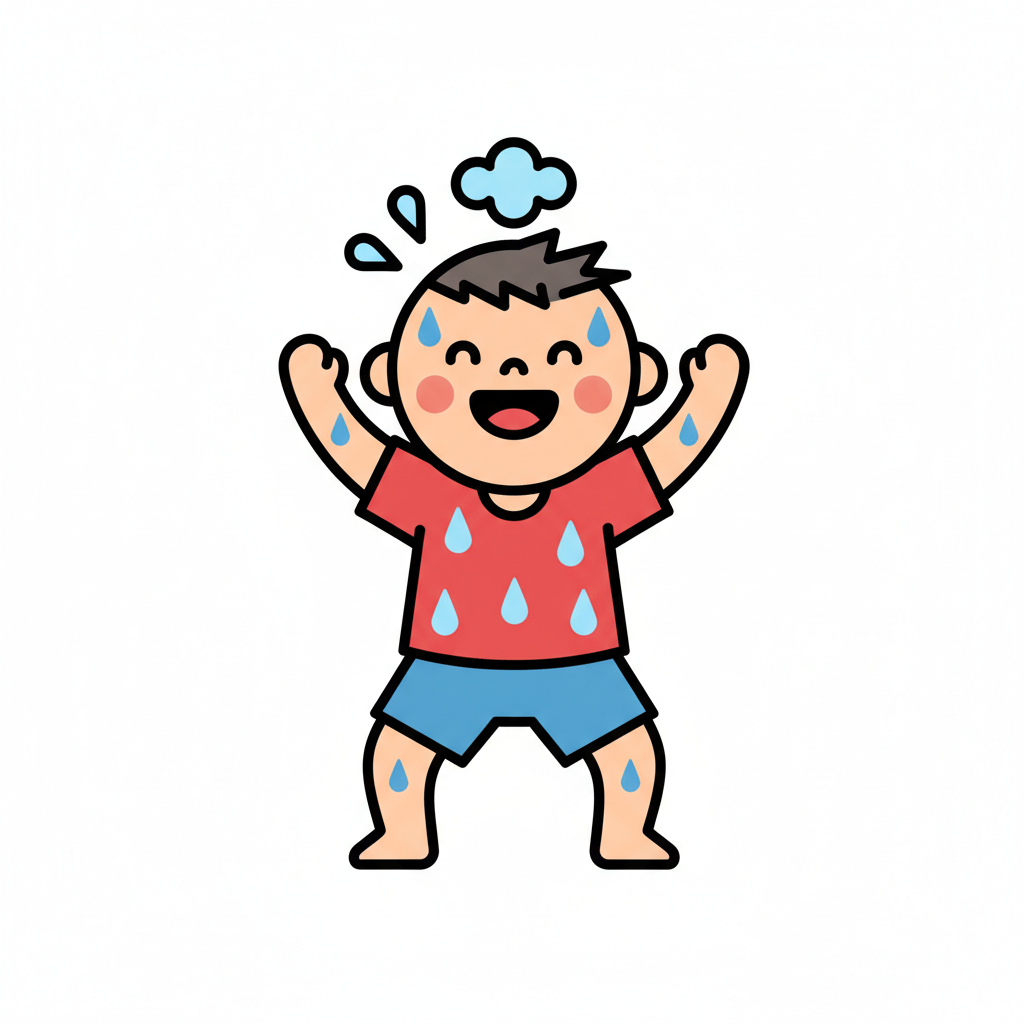 Ein lächelnder Cartoon-Junge schwitzt stark, mit Schweißperlen auf Gesicht, Haaren und Kleidung.