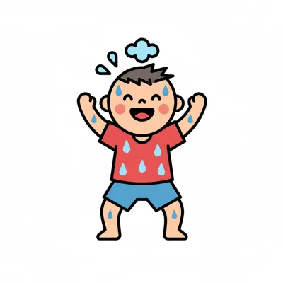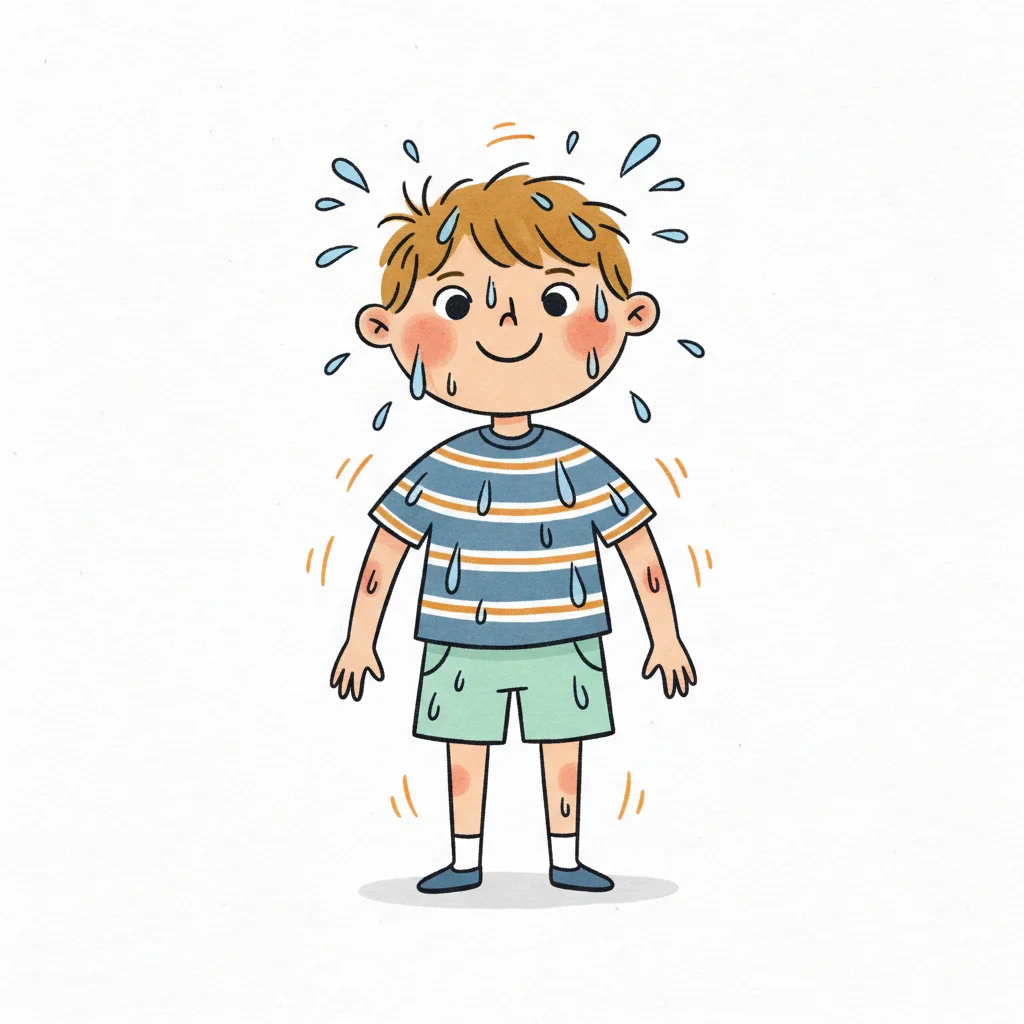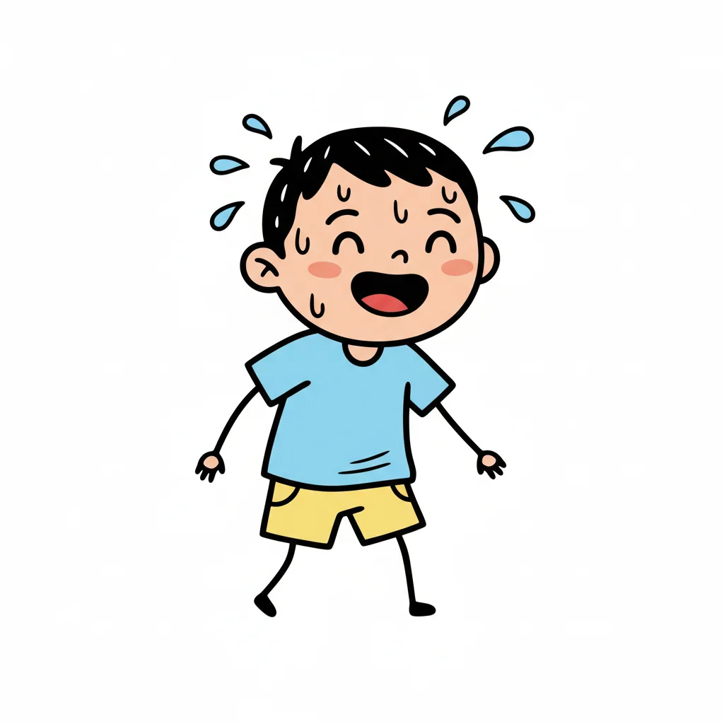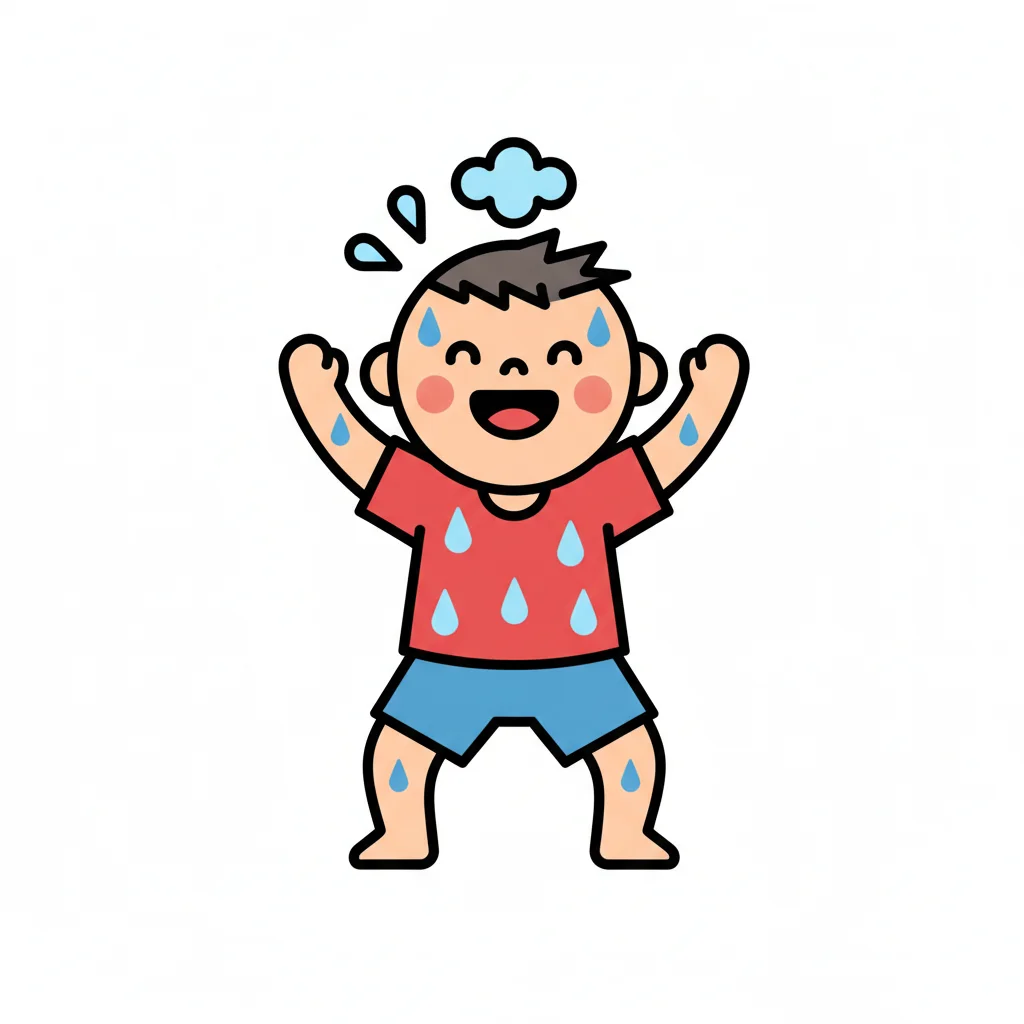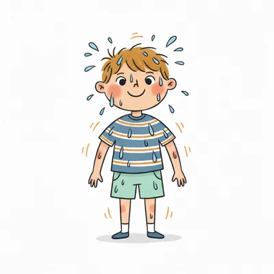 Ein lächelnder Cartoon-Junge schwitzt stark, mit Schweißperlen auf Gesicht, Haaren und Kleidung.