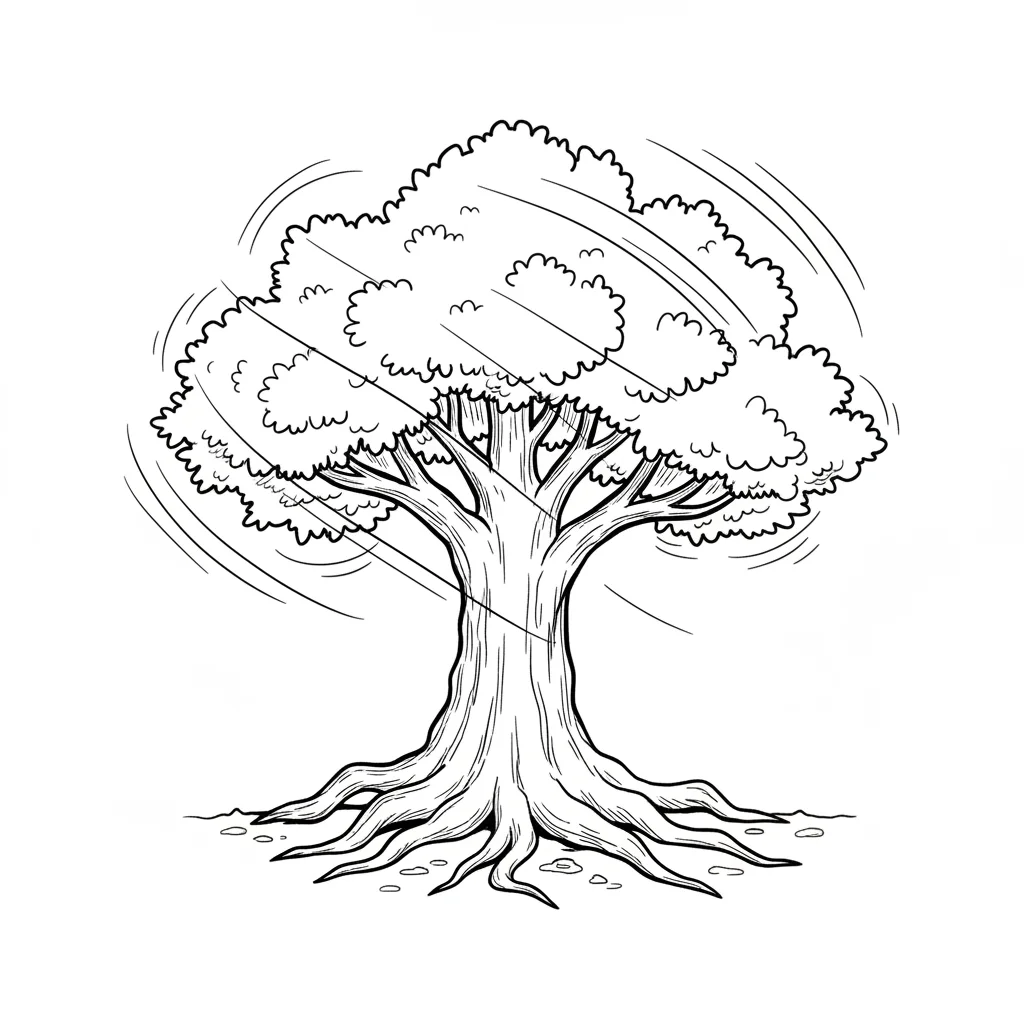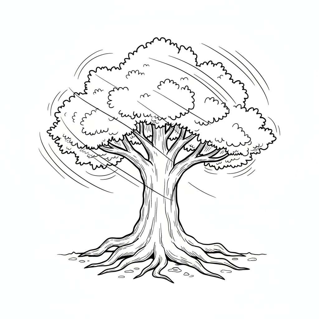 Schwarz-weiß-Zeichnung eines Baumes, dessen Blätter im Wind wehen, mit starken Wurzeln.