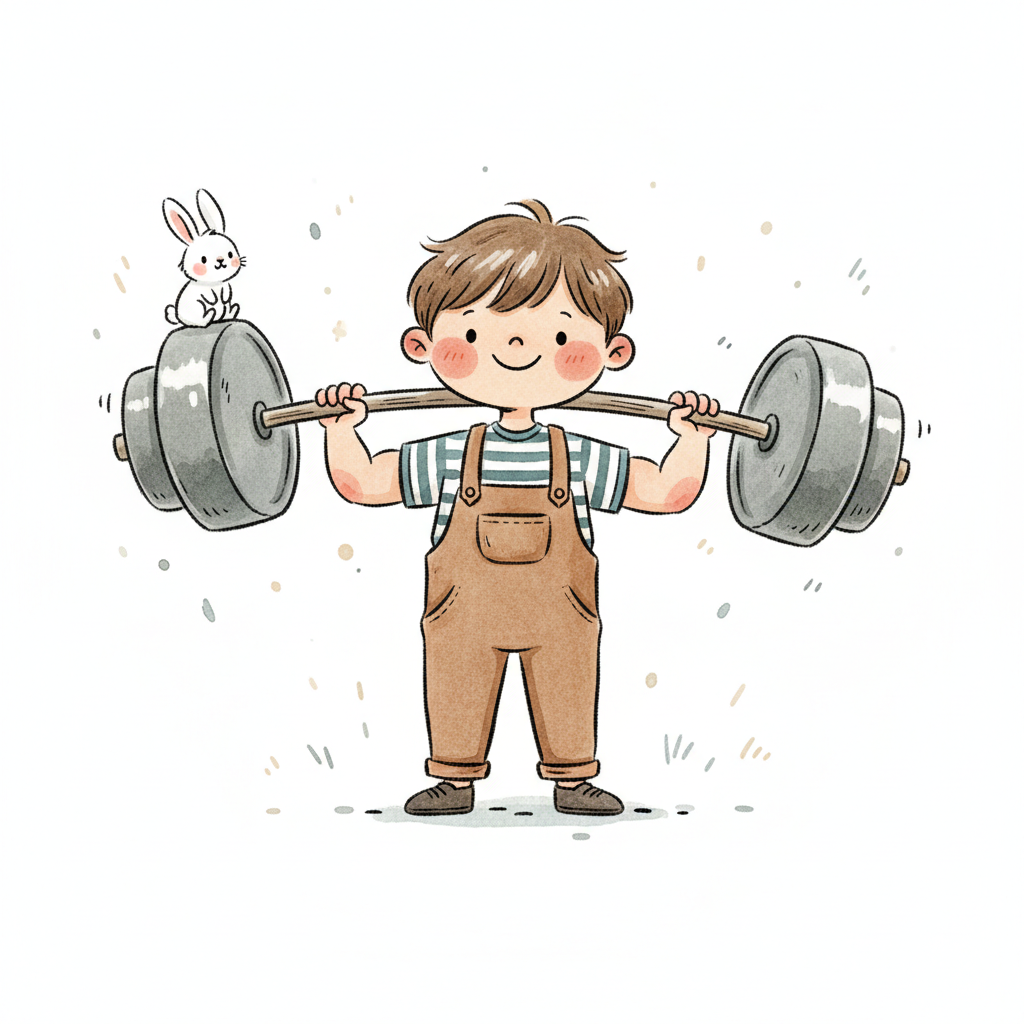 Ein fröhlicher Cartoon-Junge stemmt eine riesige Hantel, stehend auf einem Stein.