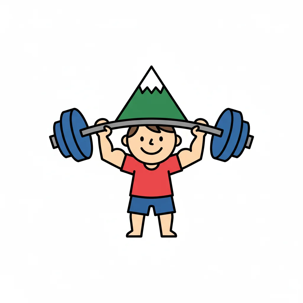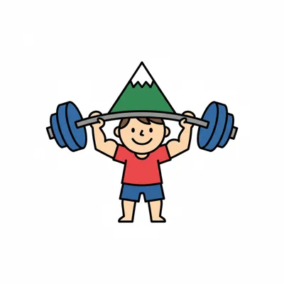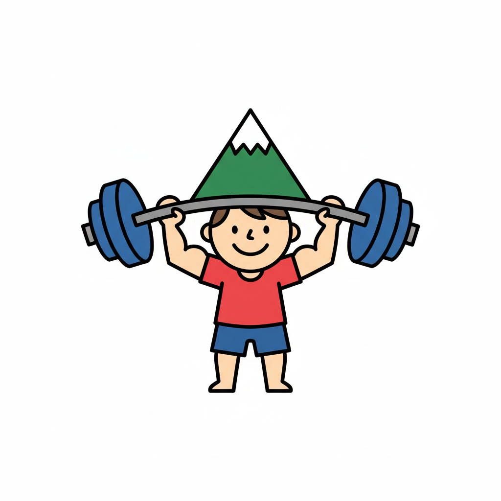 Ein lächelnder Cartoon-Mann stemmt eine Langhantel, deren Gewichte Berge sind.