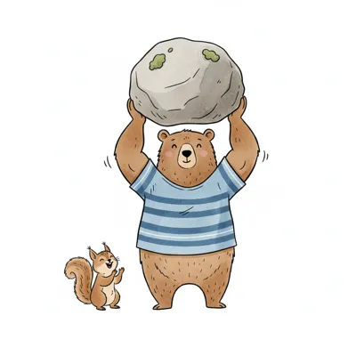 Ein starker Bär hebt einen großen Stein, während ein Eichhörnchen begeistert zuschaut.