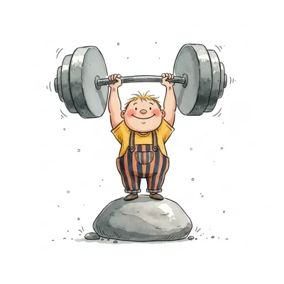 Cartoon-Figur hebt lächelnd einen großen Stein über den Kopf, zeigt dabei ihre Muskeln.