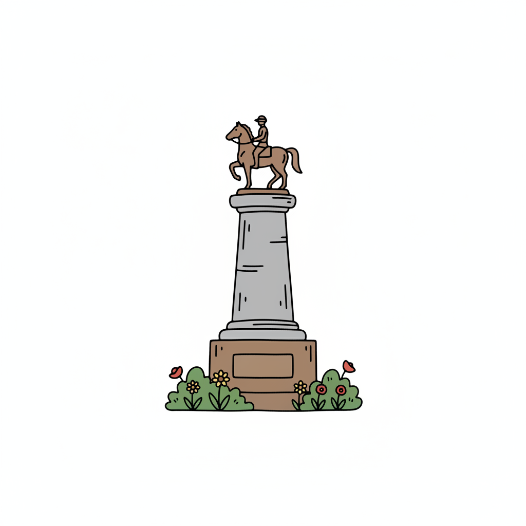 Einfache Zeichnung einer Reiterstatue auf einem hohen Sockel, umgeben von Blumen.