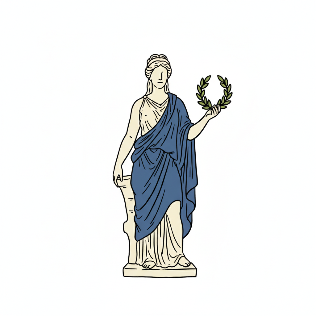 Illustration einer klassischen Frauenstatue in blauem Gewand, die einen Lorbeerkranz hält.