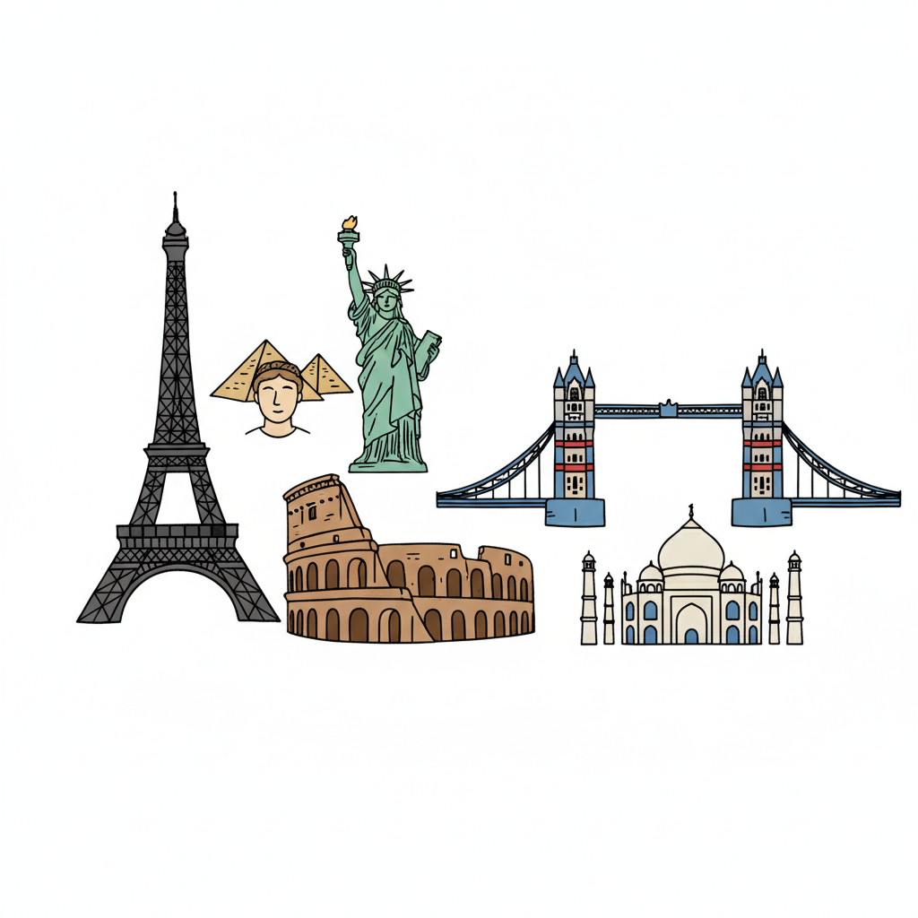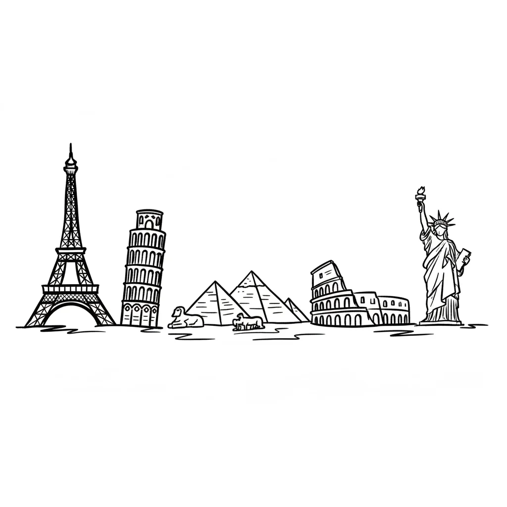 Schwarz-weiße Skizze berühmter Weltwahrzeichen: Eiffelturm, Pisa, Pyramiden, Kolosseum, Freiheitsstatue.