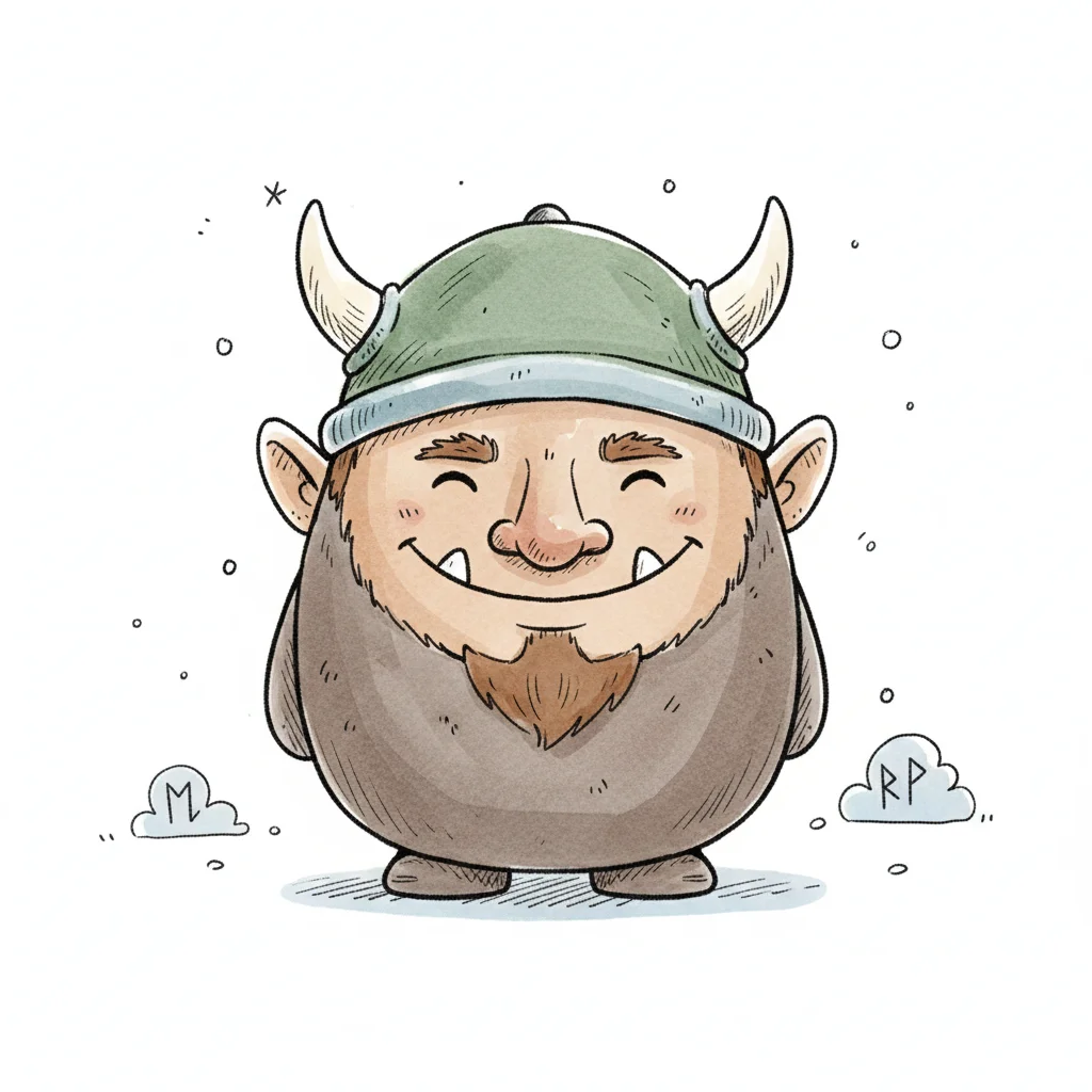 Niedliches, lächelndes Troll- oder Gnom-Wesen mit Wikingerhelm und Bart in Aquarellstil.