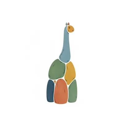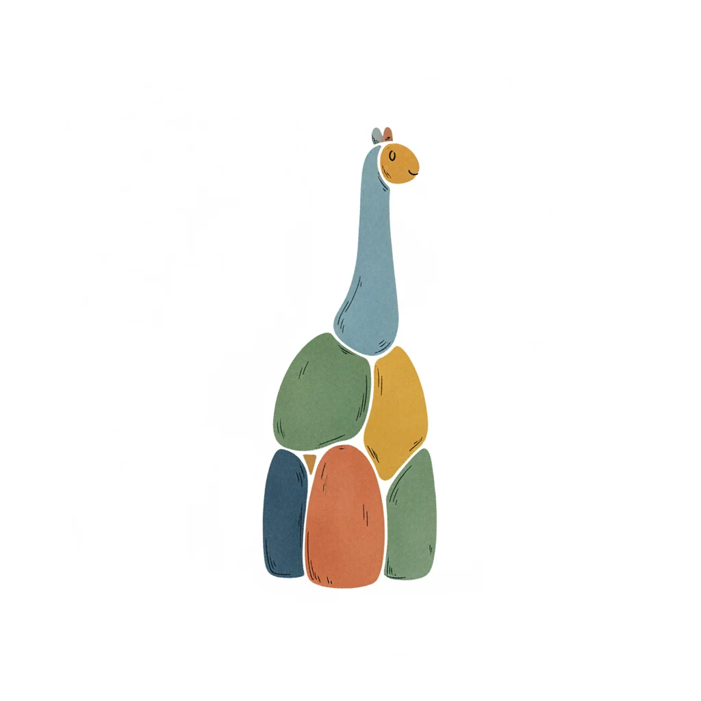 Bunte, stilisierte Giraffe aus unregelmäßigen Formen auf weißem Hintergrund.