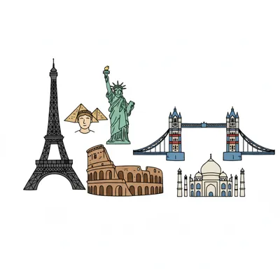 Illustration berühmter Weltwahrzeichen: Eiffelturm, Freiheitsstatue, Kolosseum, Tower Bridge, Taj Mahal.