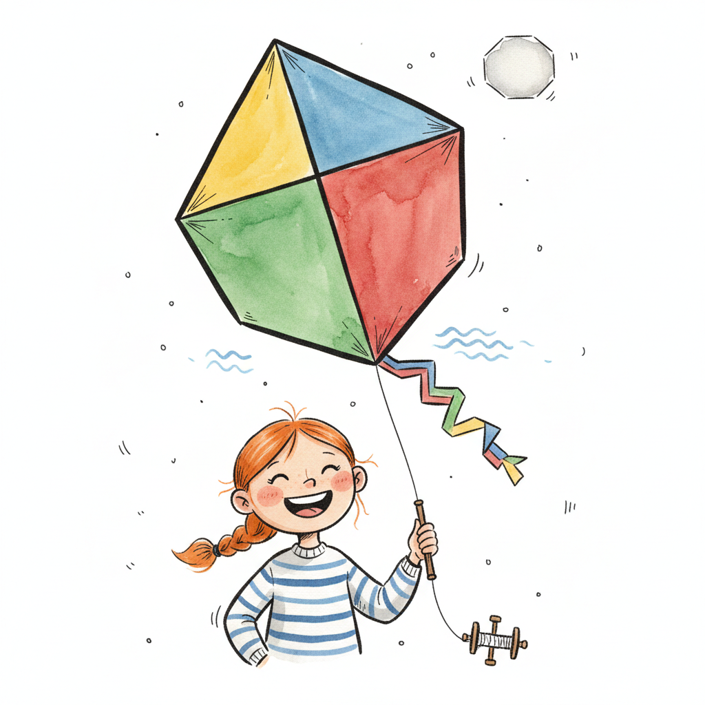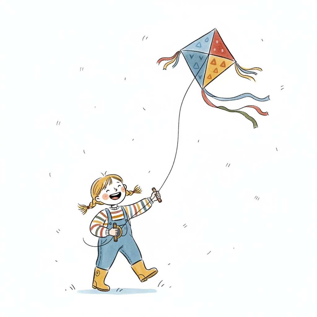 Ein fröhliches Mädchen mit Zöpfen lässt einen bunten Drachen im Wind steigen.