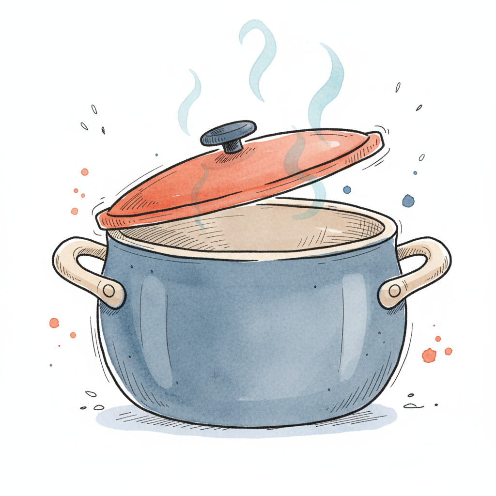 Aquarell-Illustration eines blauen Kochtopfs mit leicht geöffnetem rotem Deckel und aufsteigendem Dampf.