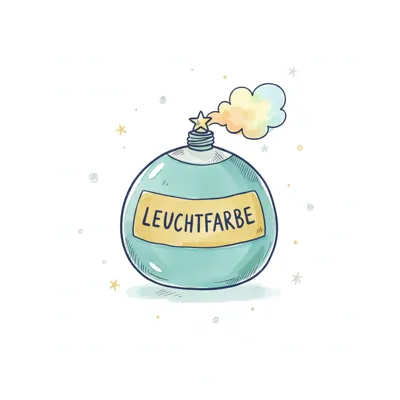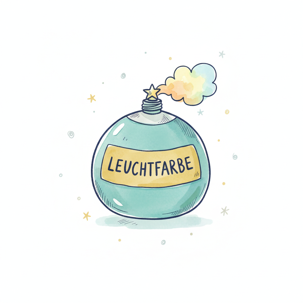 Niedliche Illustration einer Flasche Leuchtfarbe, aus der ein Stern und bunter Rauch aufsteigen.