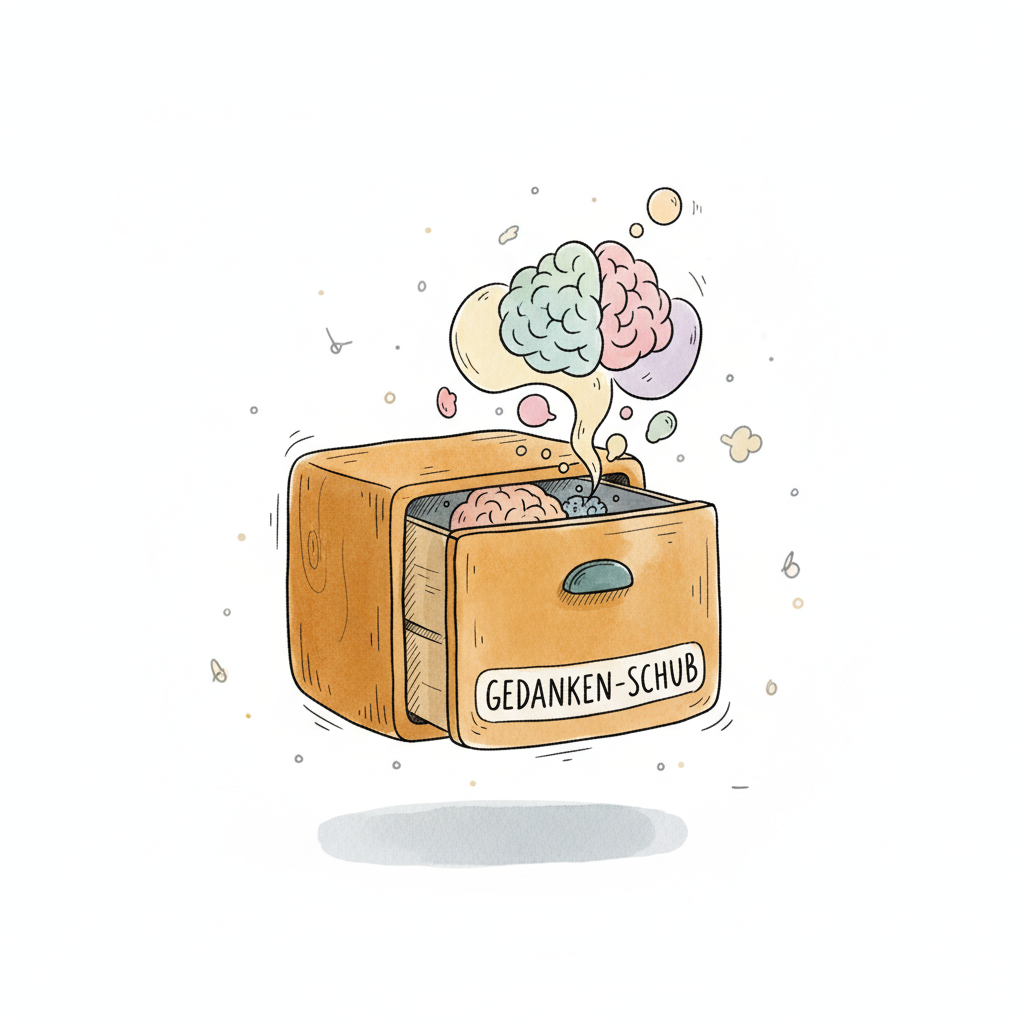 Bunte Gehirne steigen aus einer Schublade mit der Aufschrift 'Gedanken-Schub' auf.