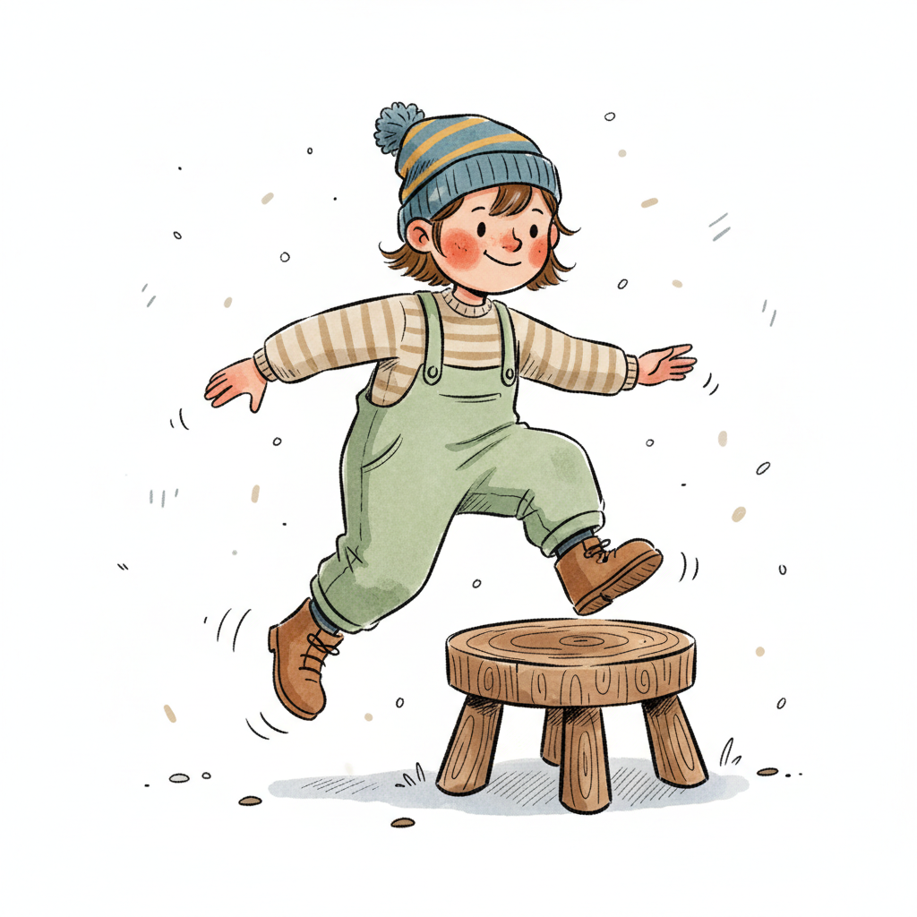 Ein lächelndes Kind in Mütze und Latzhose springt spielerisch auf einen Holzschemel.