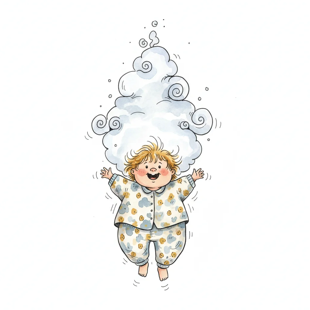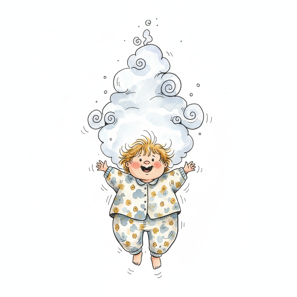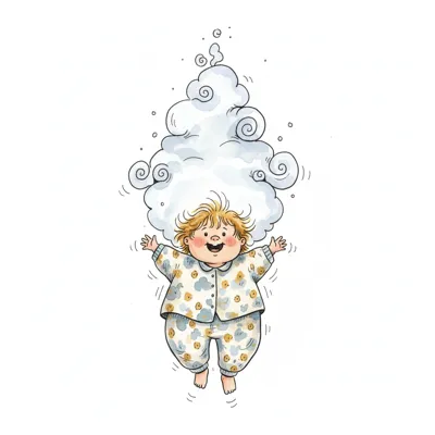Ein fröhliches Kind in Pyjama schwebt mit einer großen, flauschigen Wolke auf dem Kopf.