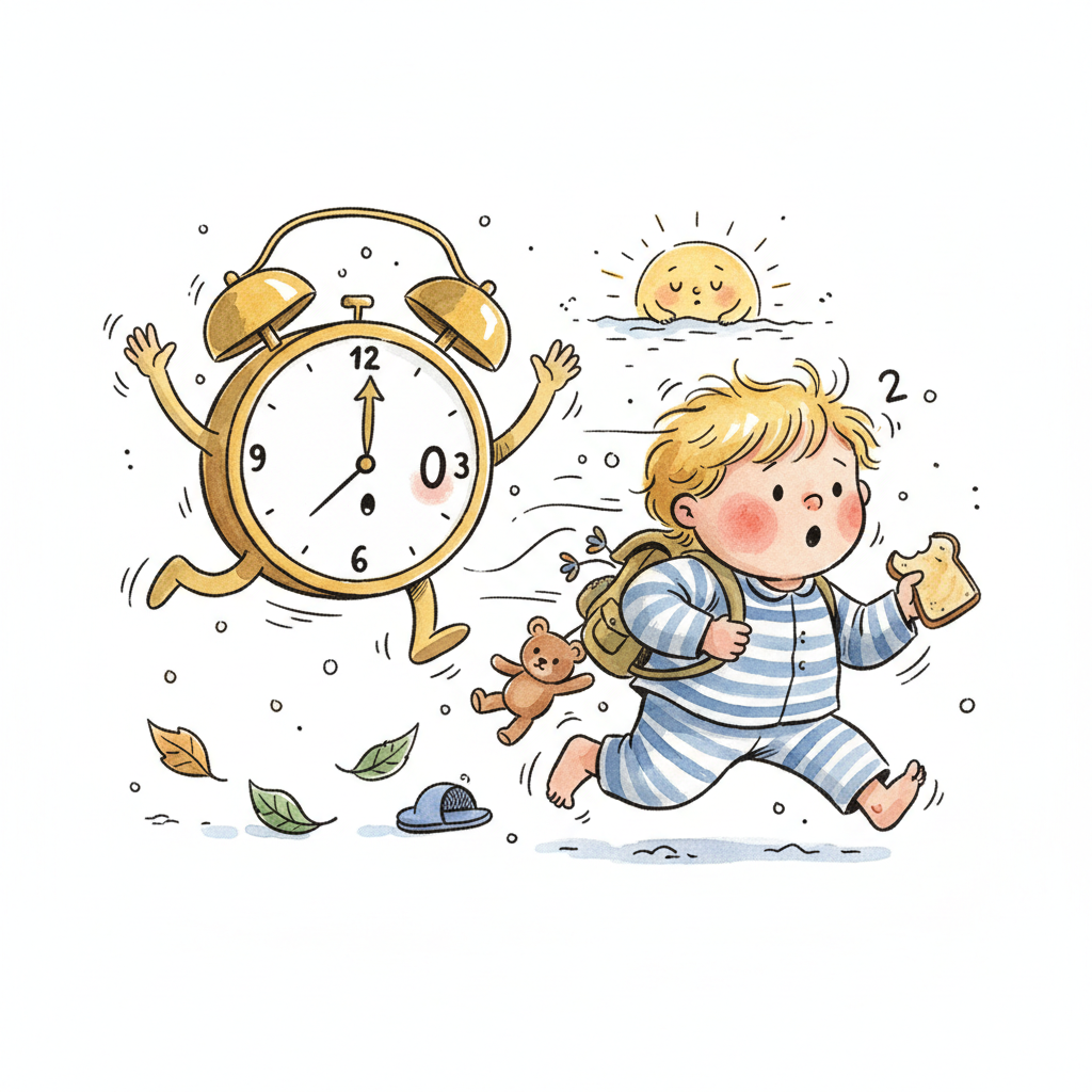 Ein Kind in Pyjamas rennt eilig mit Toast, während ein Wecker und die Sonne aufsteigen.