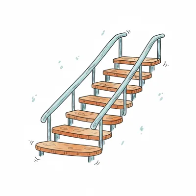 Bunte Cartoon-Zeichnung einer Holztreppe mit blauen Geländern, aufsteigend auf weißem Grund.