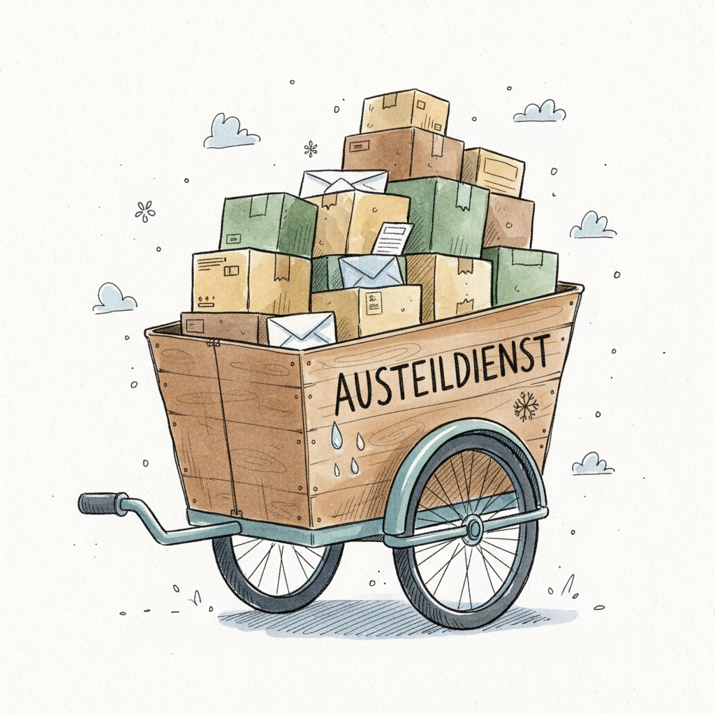 Überfüllter Holzkarren des Austeildienstes mit Paketen und Briefen, umgeben von Schneeflocken.