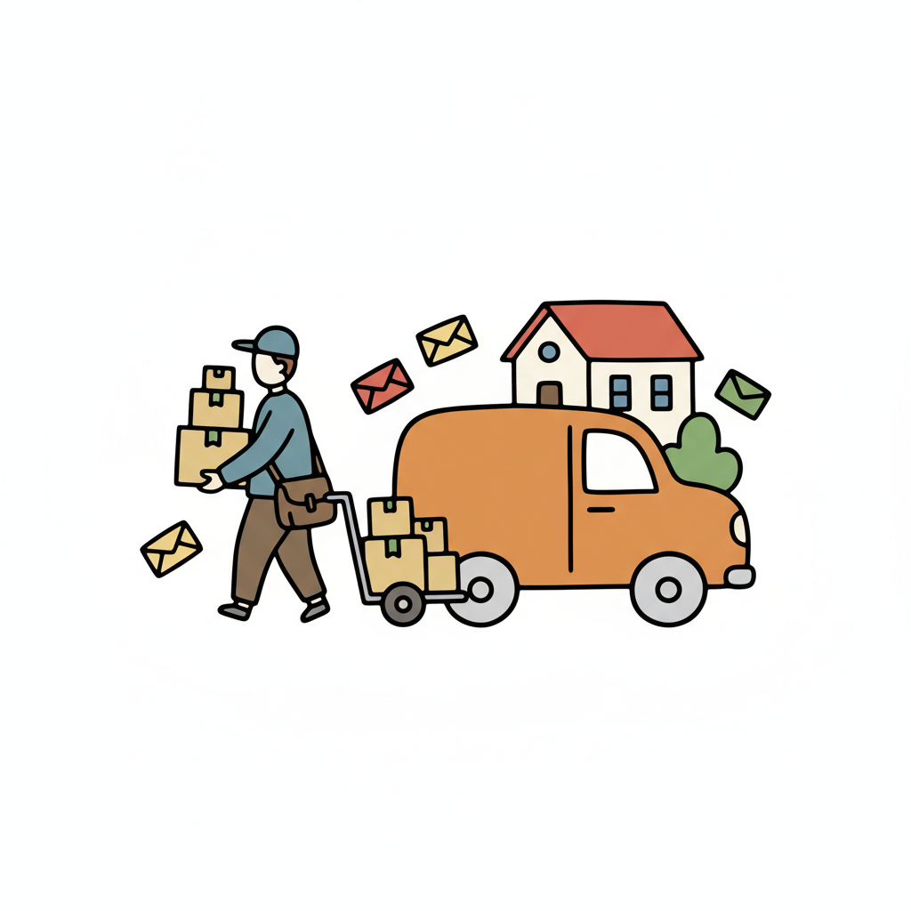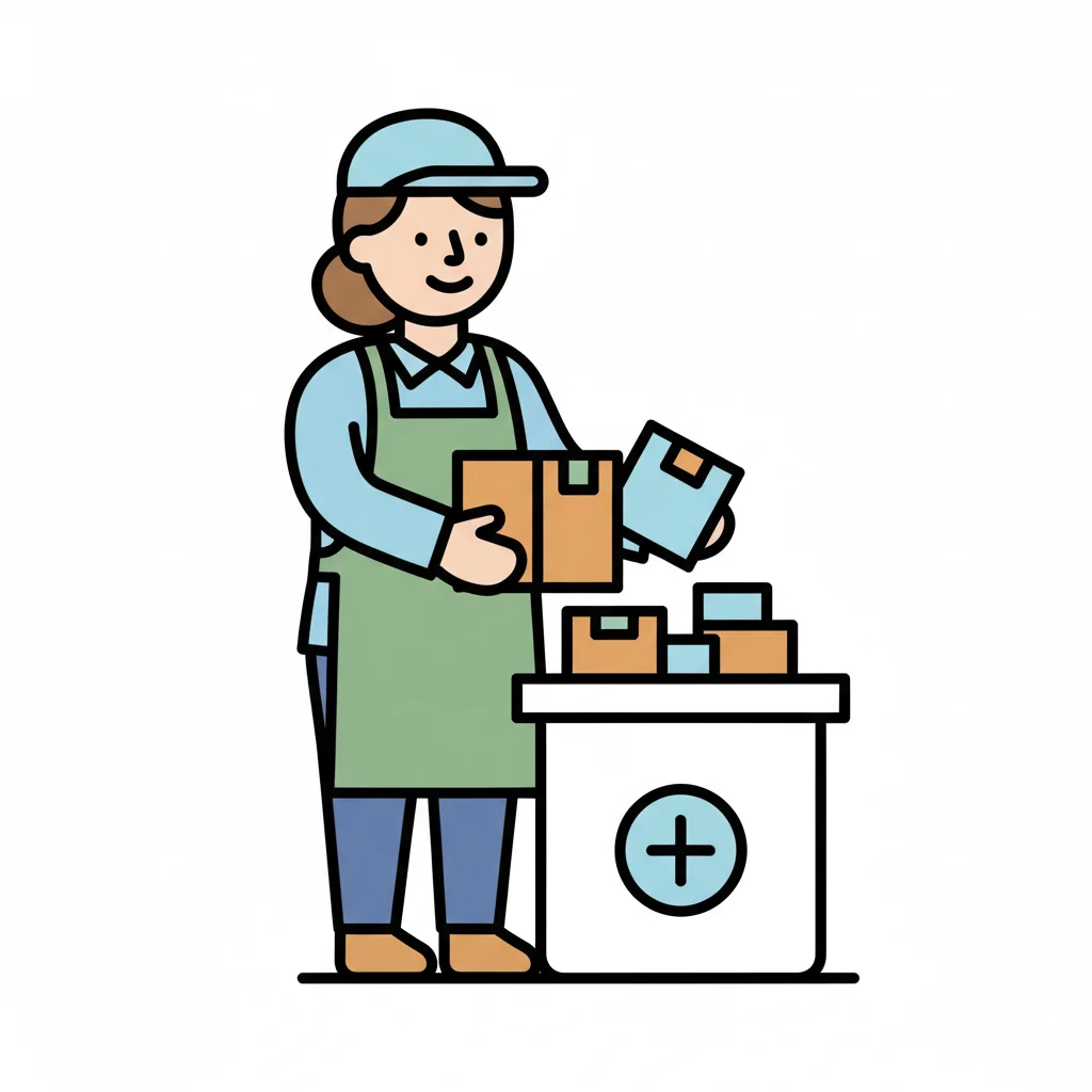 Illustration einer Person in Schürze und Kappe, die Pakete in einen Behälter sortiert.
