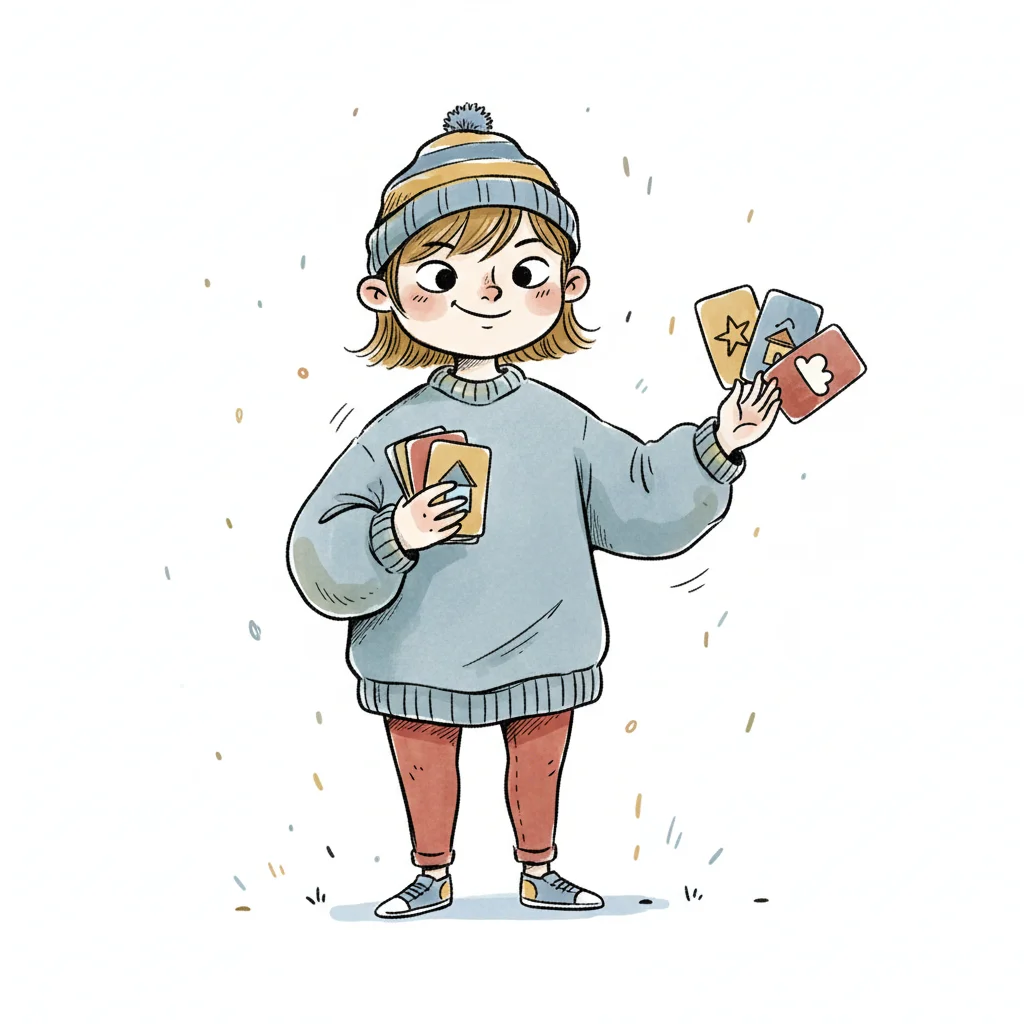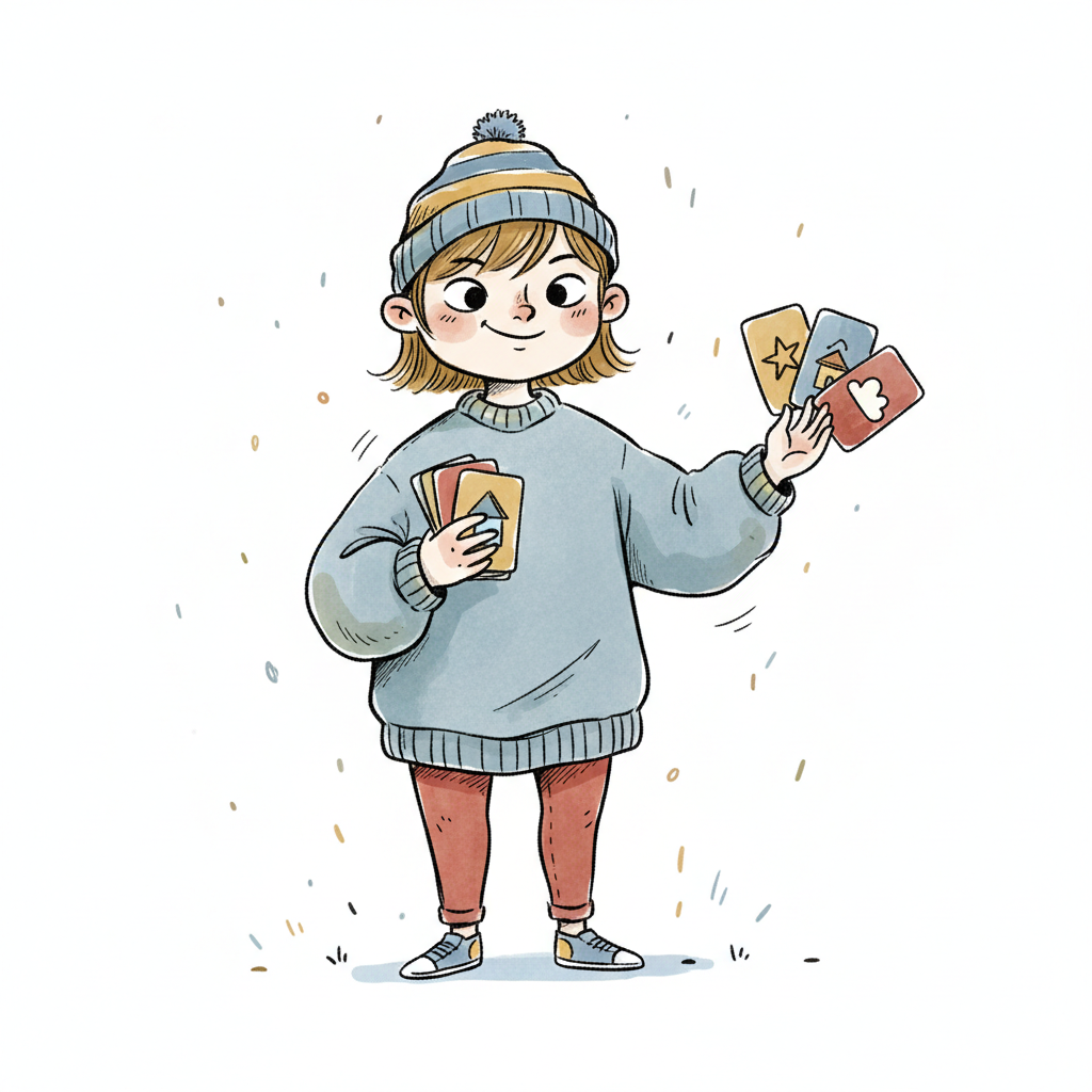 Fröhliches Cartoon-Kind in Mütze und Pullover zeigt Spielkarten mit Haus, Stern und Wolke.