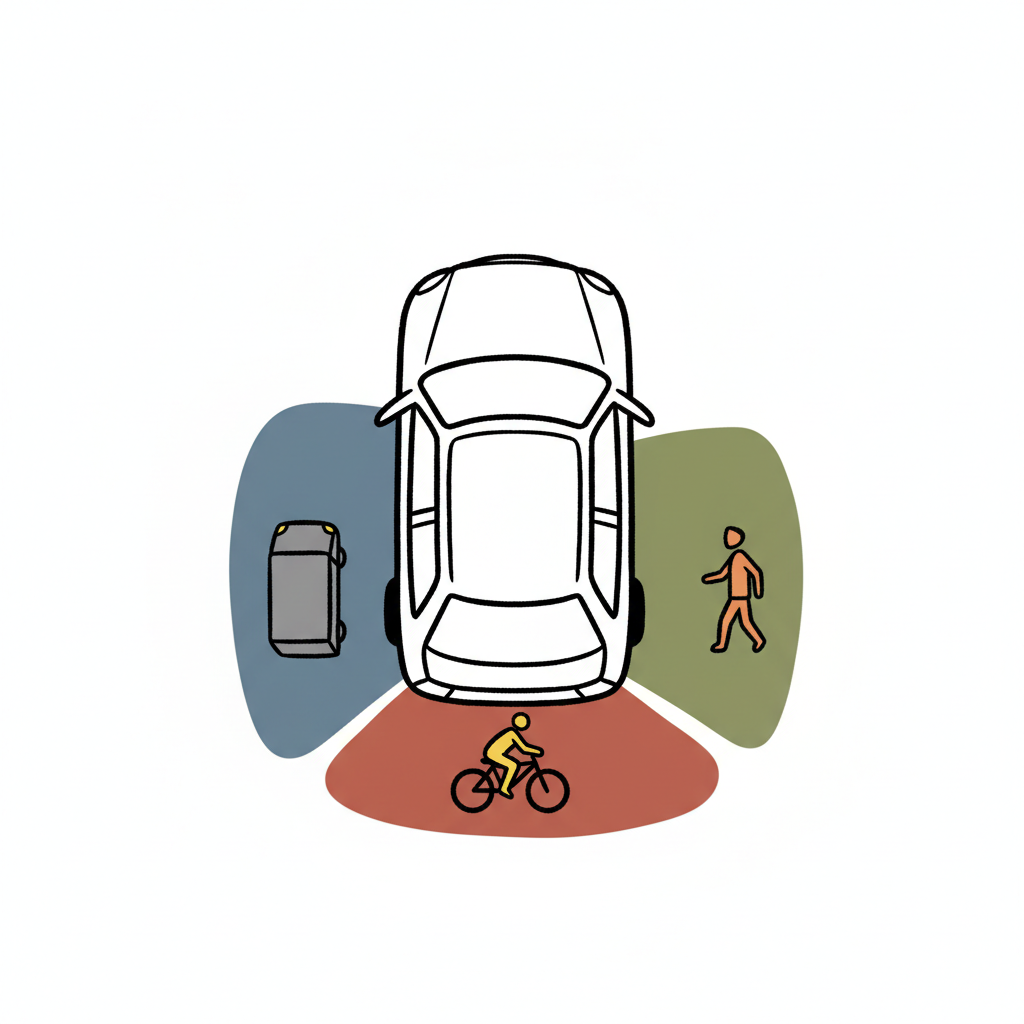 Auto mit umliegenden Verkehrsteilnehmern (Radfahrer, Fußgänger, Auto) in farbigen Sektoren.