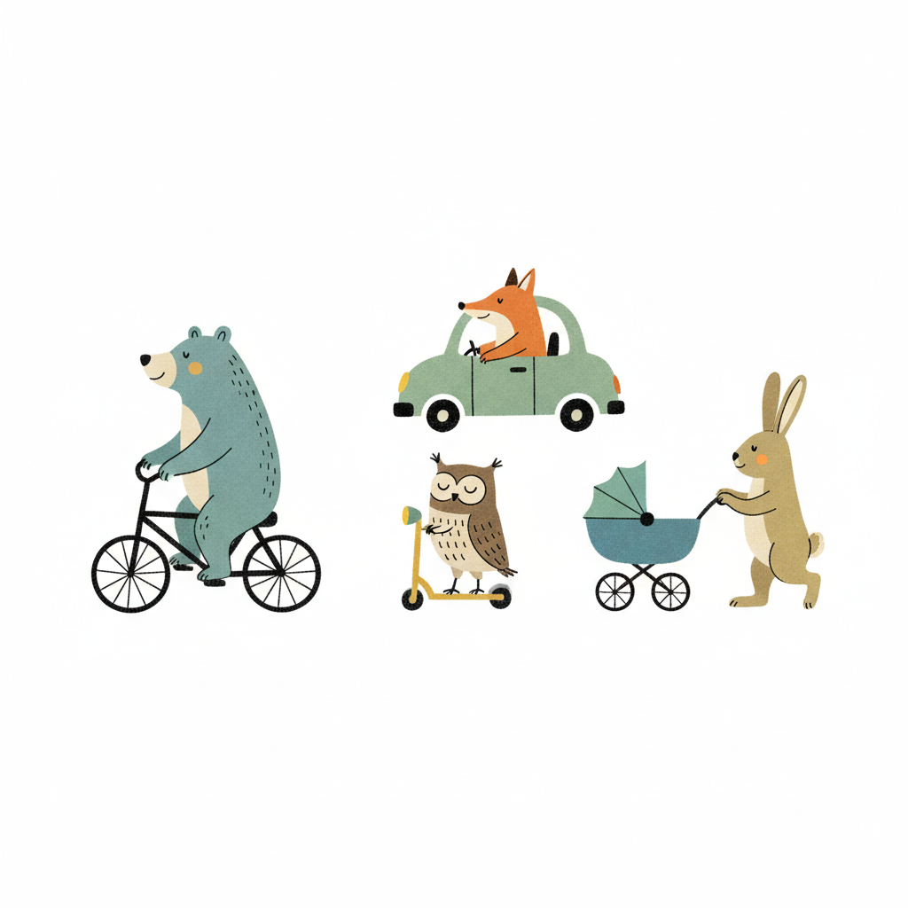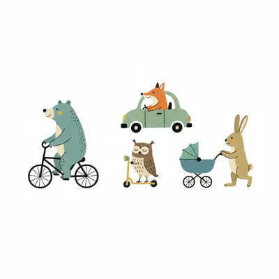 Bär, Fuchs, Eule und Hase fahren mit verschiedenen Fahrzeugen. Süße Tierillustration.
