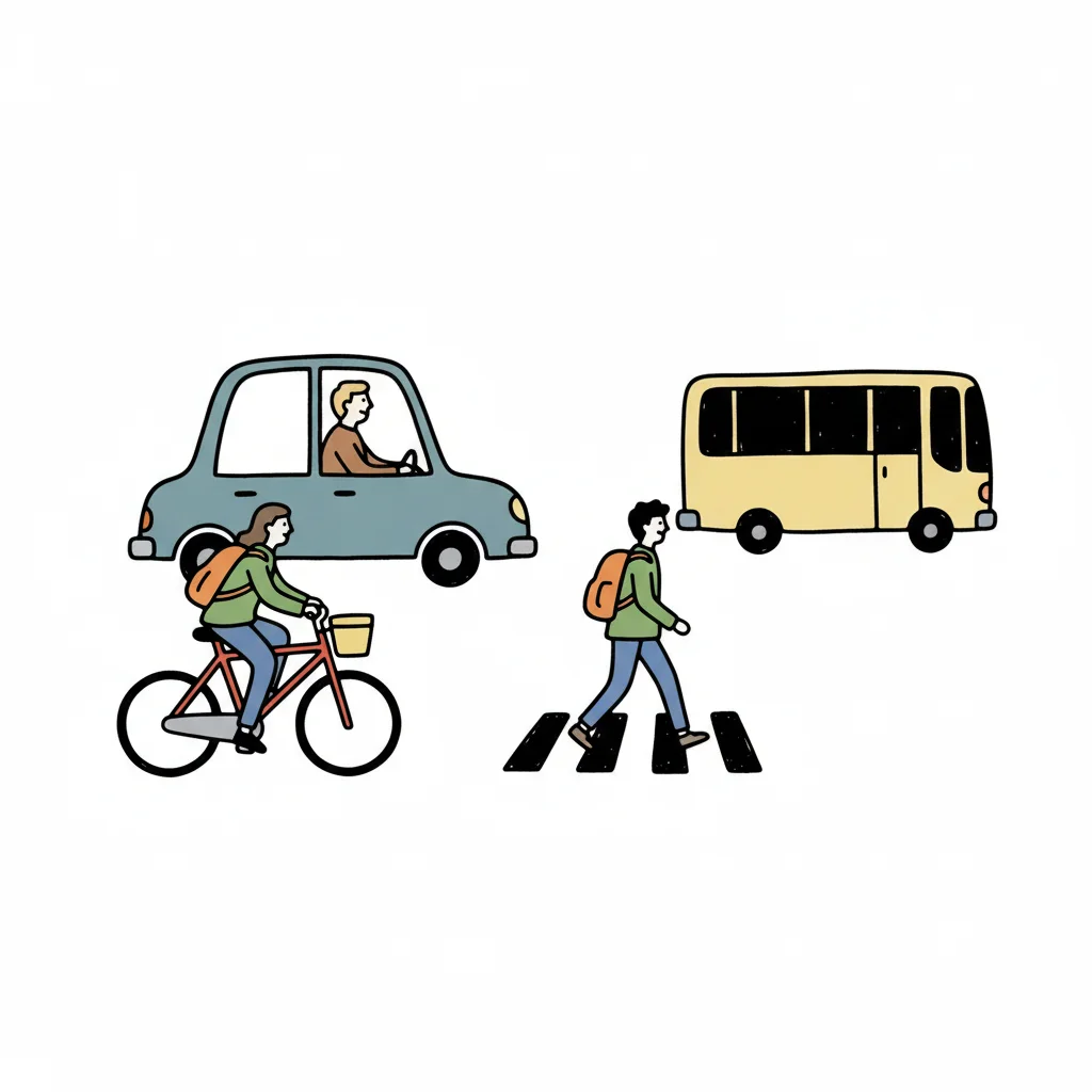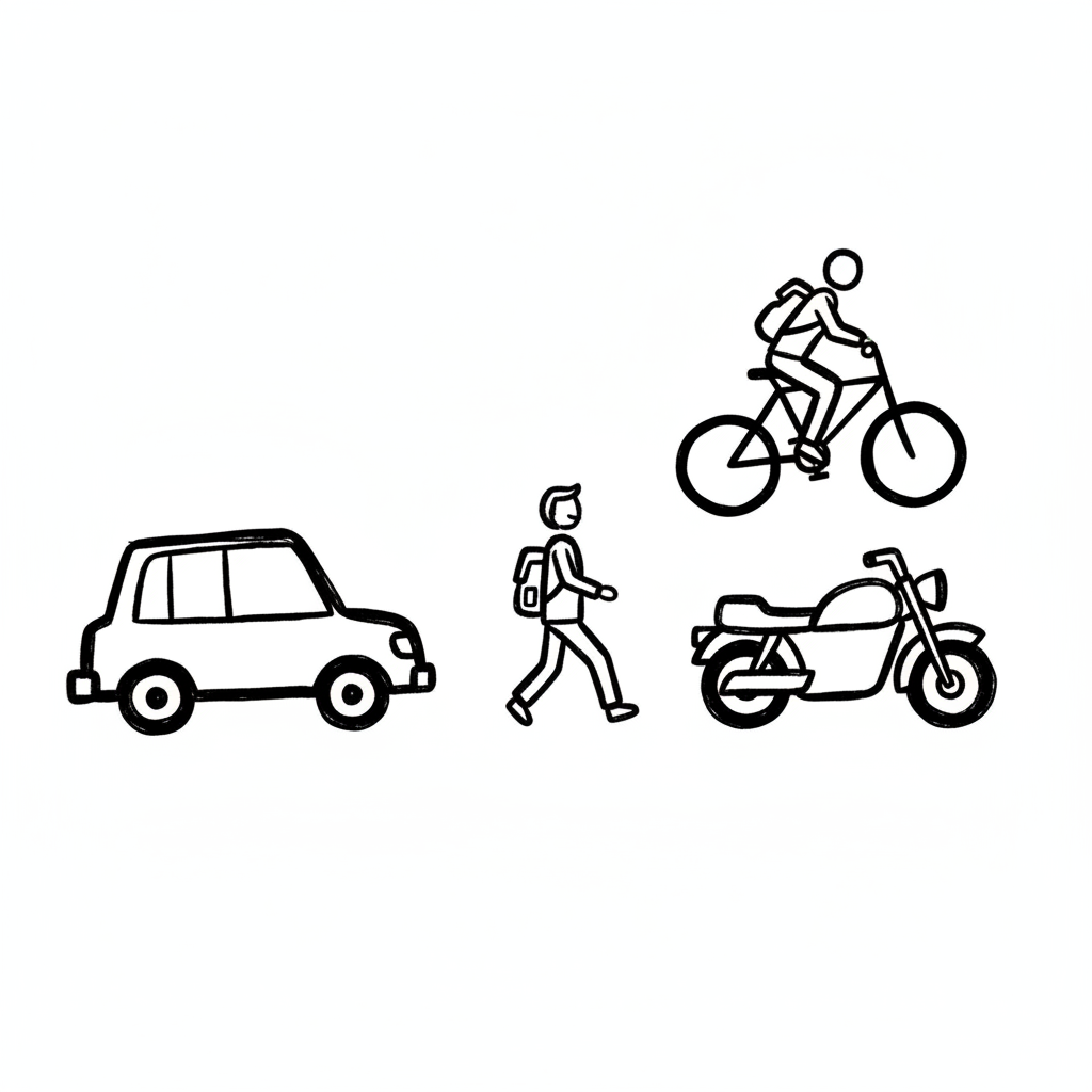 Strichzeichnungen von Auto, Fußgänger, Radfahrer und Motorrad als Transportmittel.