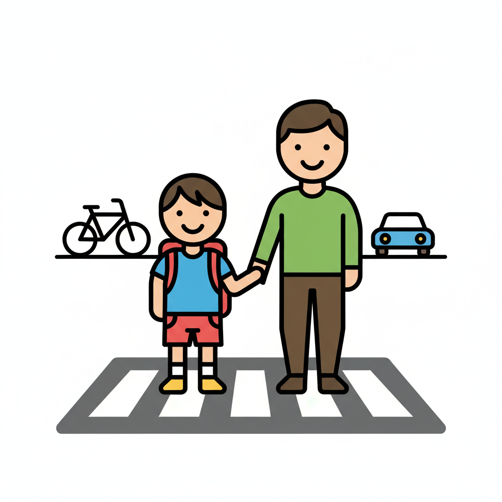 Vater und Kind überqueren Hand in Hand einen Zebrastreifen, umgeben von Verkehrssymbolen.