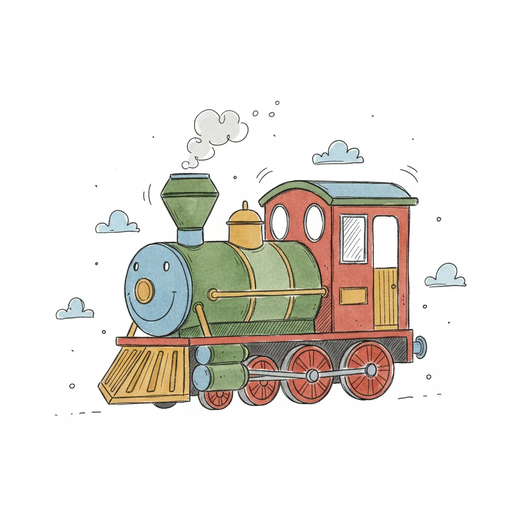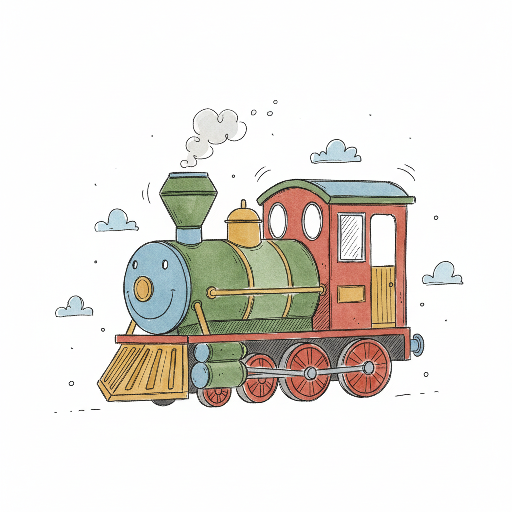 Bunte, lächelnde Cartoon-Dampflok mit Rauch und Wolken im Aquarell-Stil.