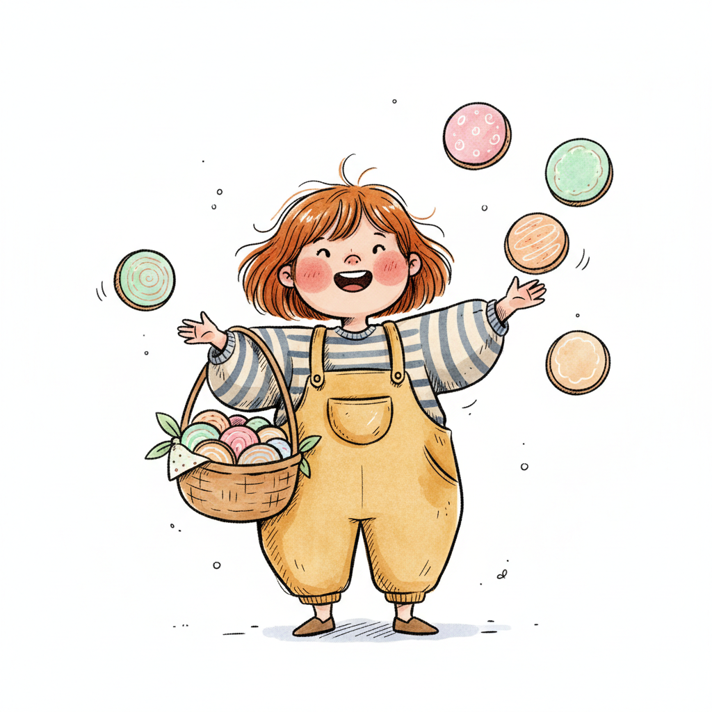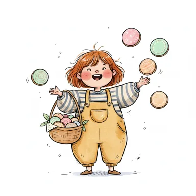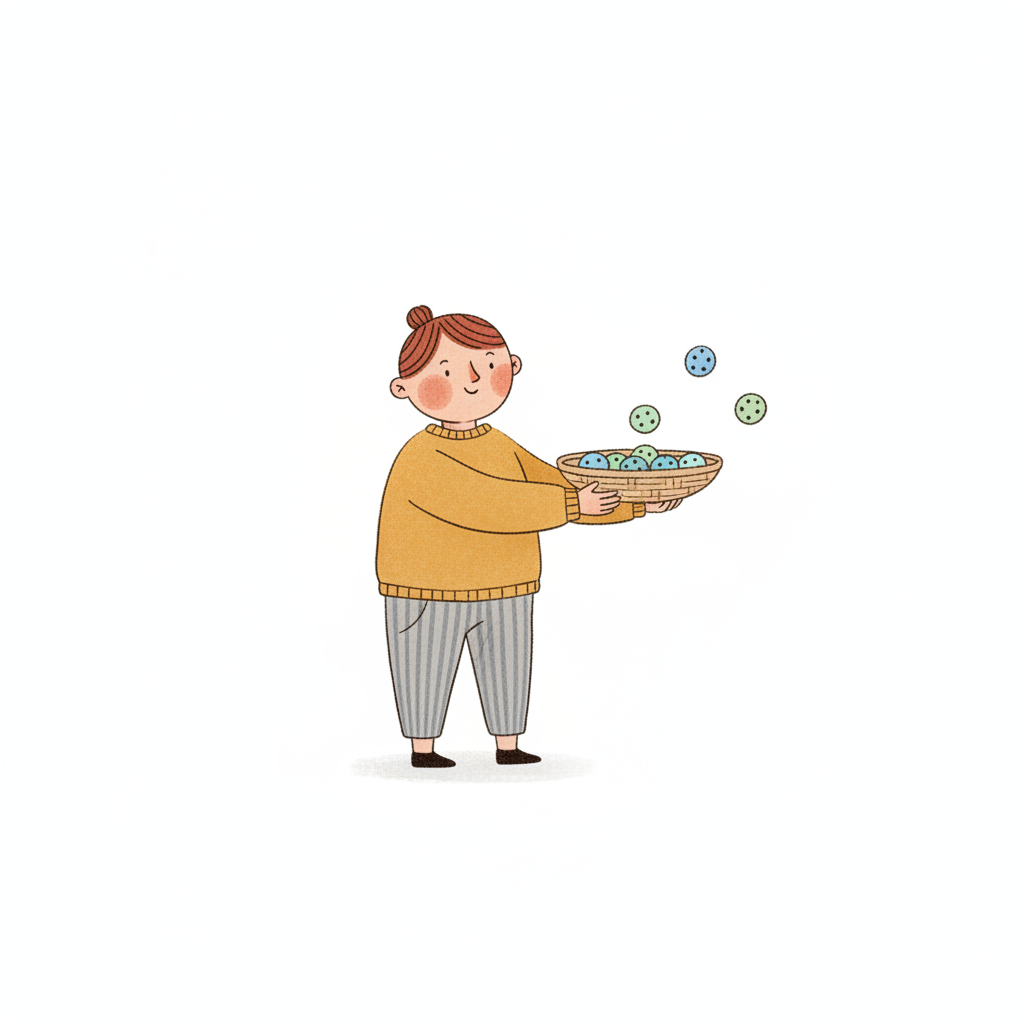 Eine lächelnde Cartoonfigur hält einen Korb voller bunter Bälle, die schweben.