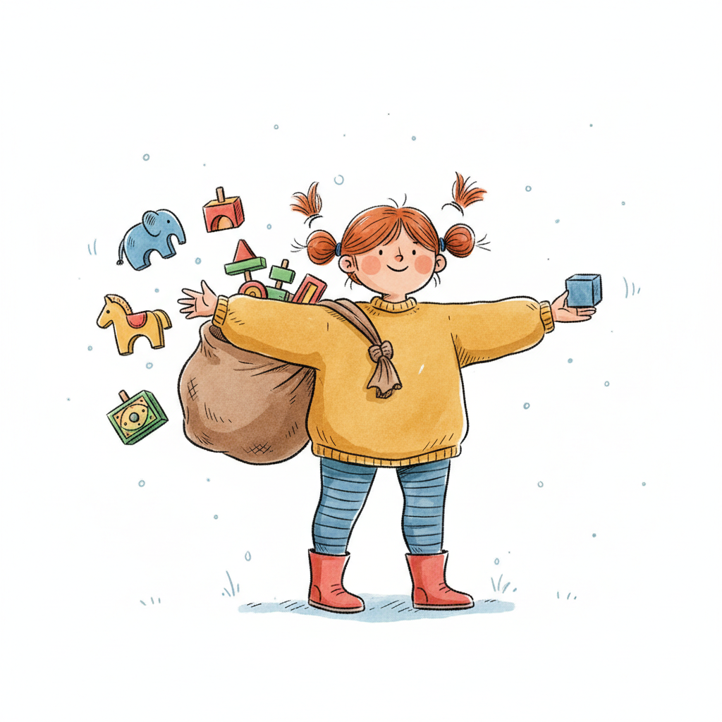 Fröhliches Mädchen mit Zöpfen verteilt Holzspielzeug aus einem Sack und hält einen Block.